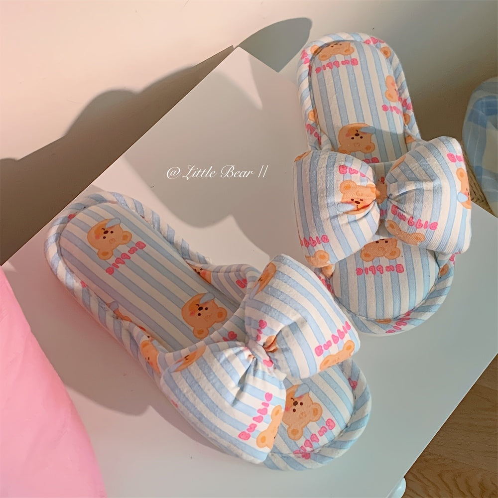 Girls Bear Striped Slippers Linen Fabric Indoor Footwear with Bow