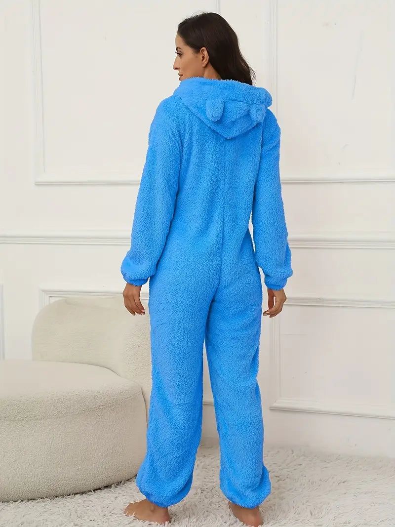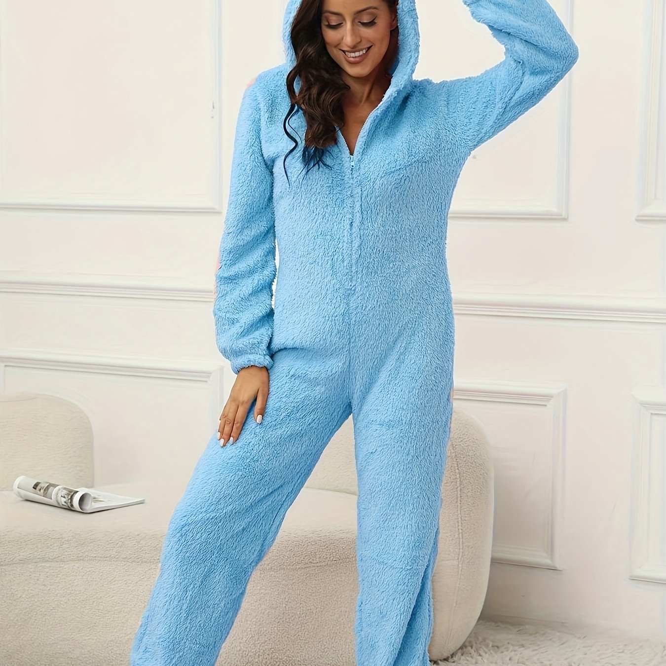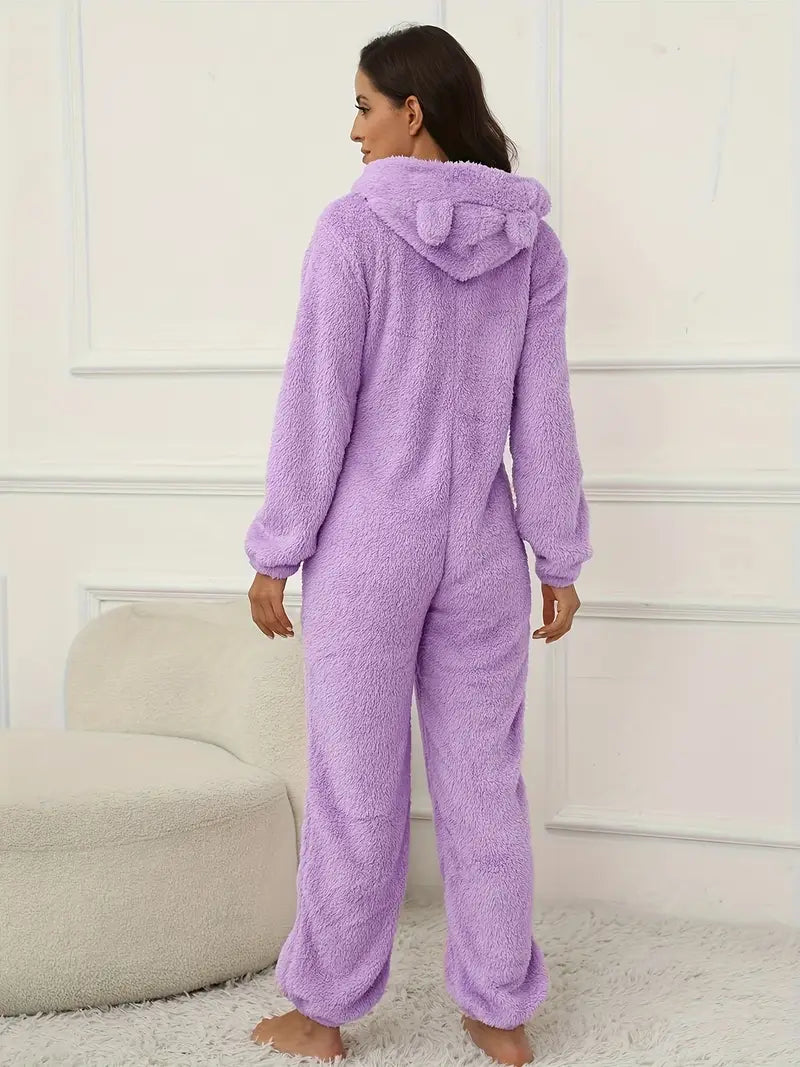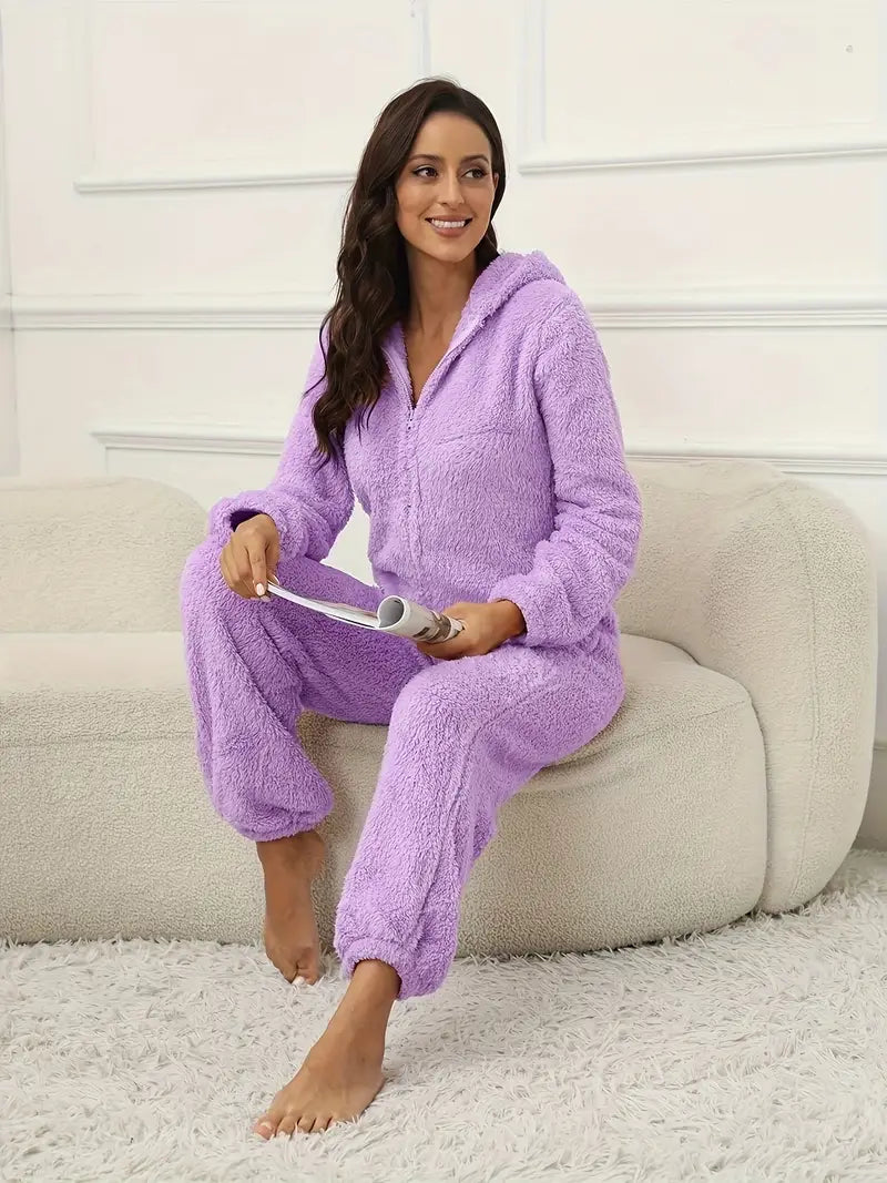 Women's Fuzzy Hooded Lounge Jumpsuit with Zipper Long Sleeve Fall Winter Casual