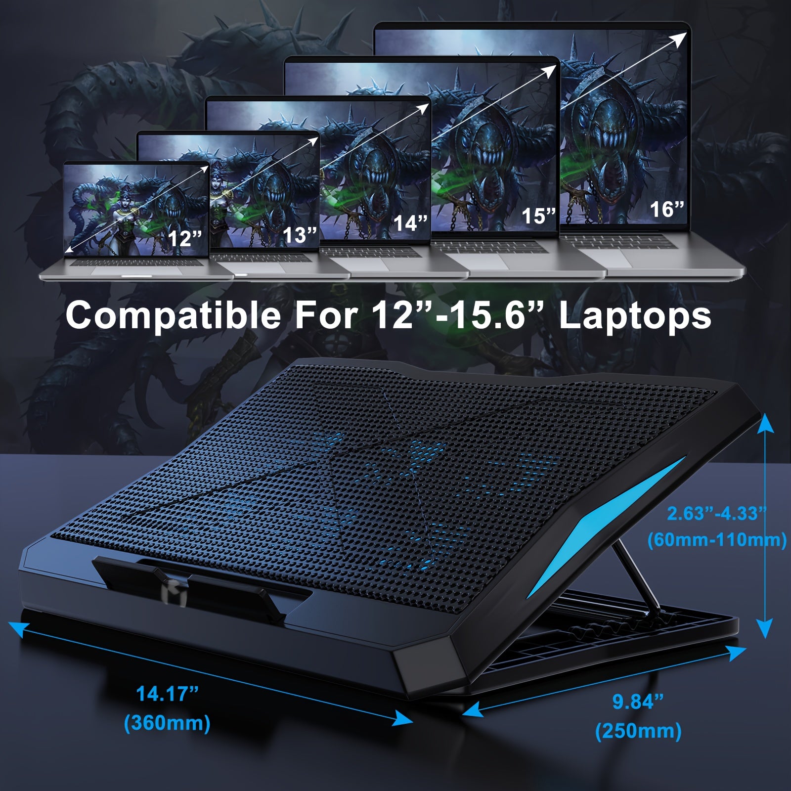 Laptop Cooling Stand with 6 Fans Adjustable Height LED Light USB Ports for 22.86-39.62 cm Laptops