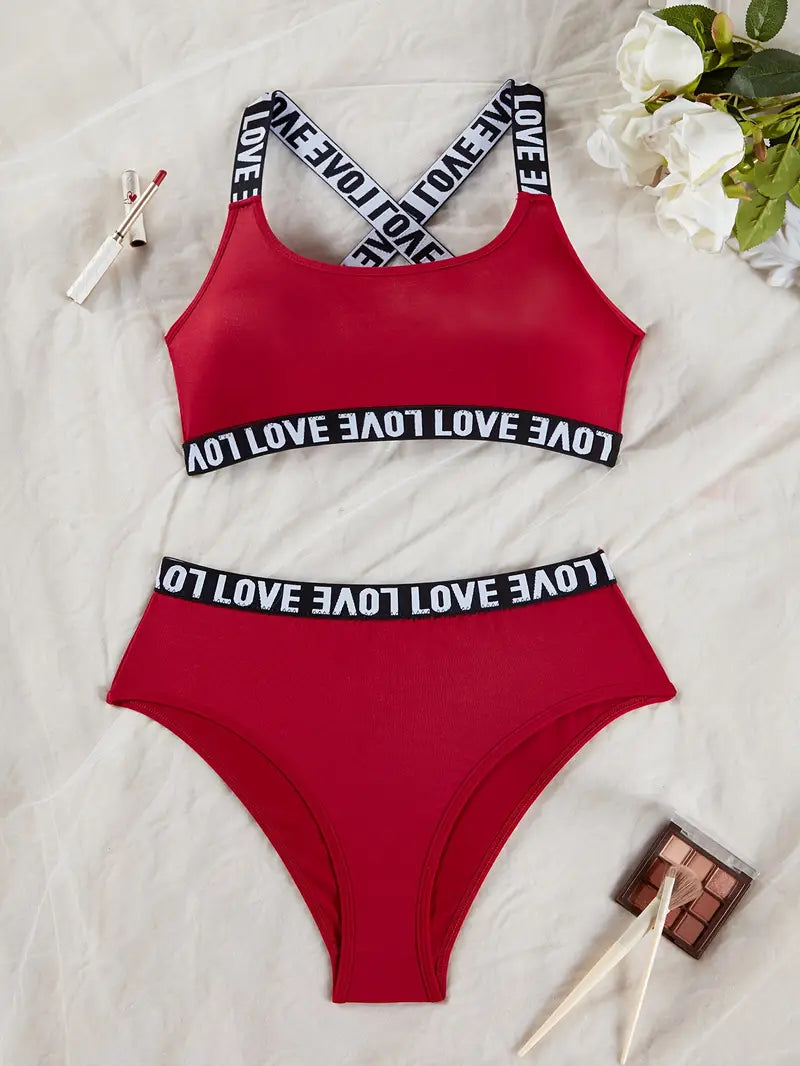 Women’s Letter Print Lingerie Set with Criss Cross Back Sports Bra and Elastic Panties