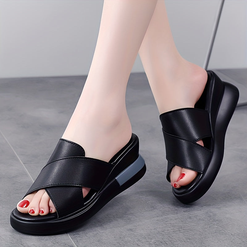 Women's Black Wedge Sandals Slip-On Platform Open Toe Rubber Sole Summer