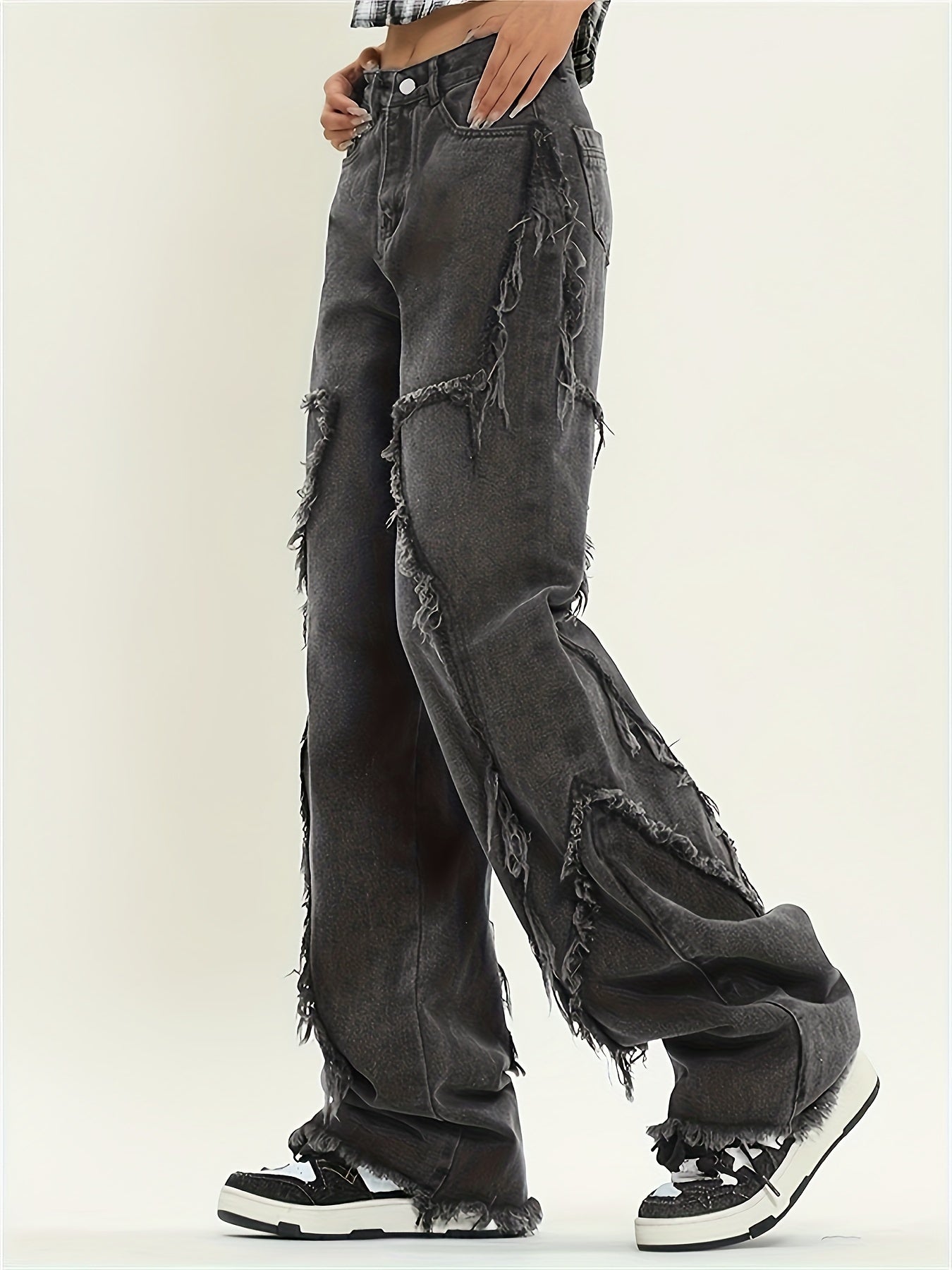 Men's Black Frayed Hem Wide-Leg Jeans 80% Cotton Relaxed Fit Casual Pants