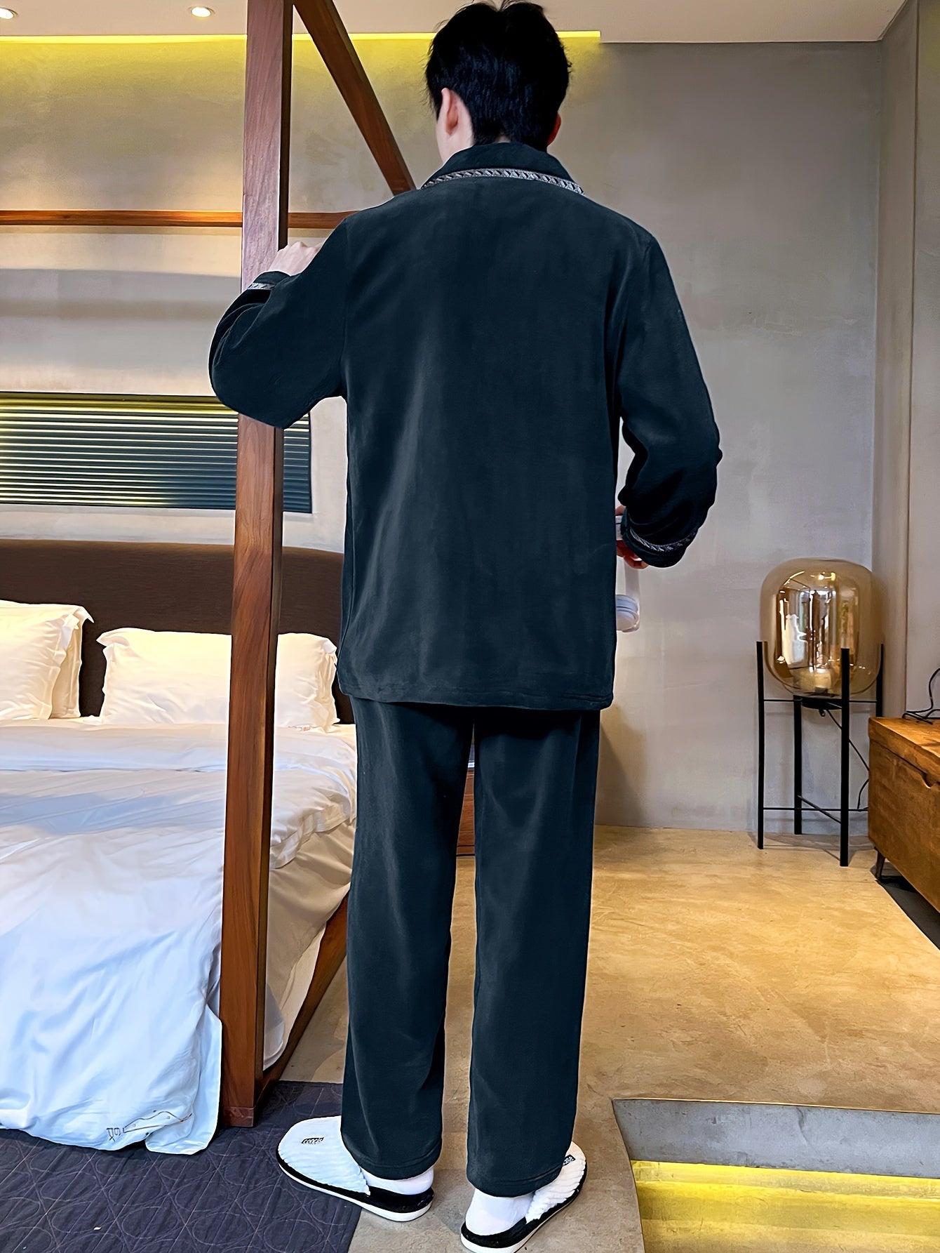 Men's Casual Striped Flannel Pajama Set Long Sleeve Knit Polyester Loose Fit for Fall Winter