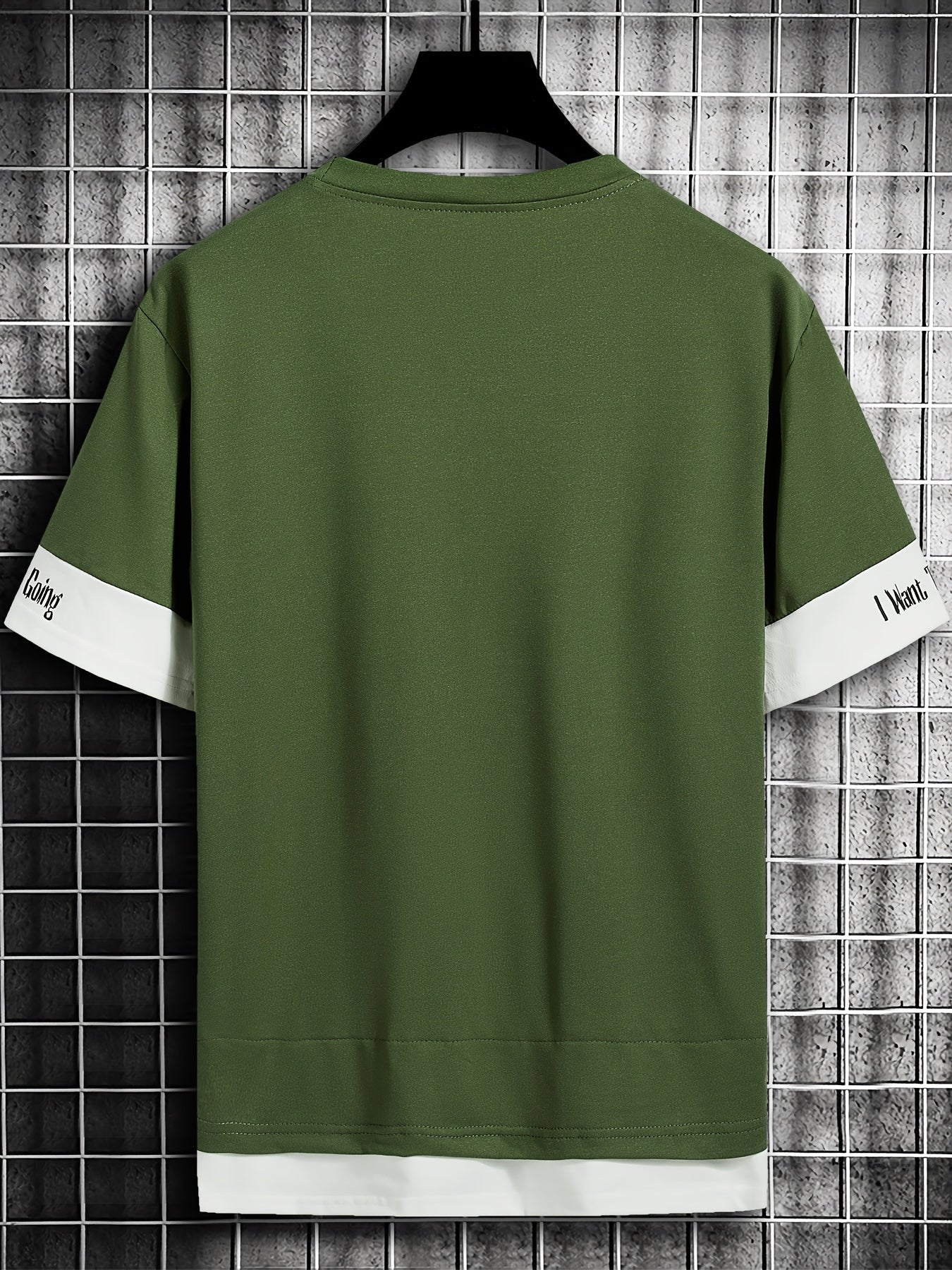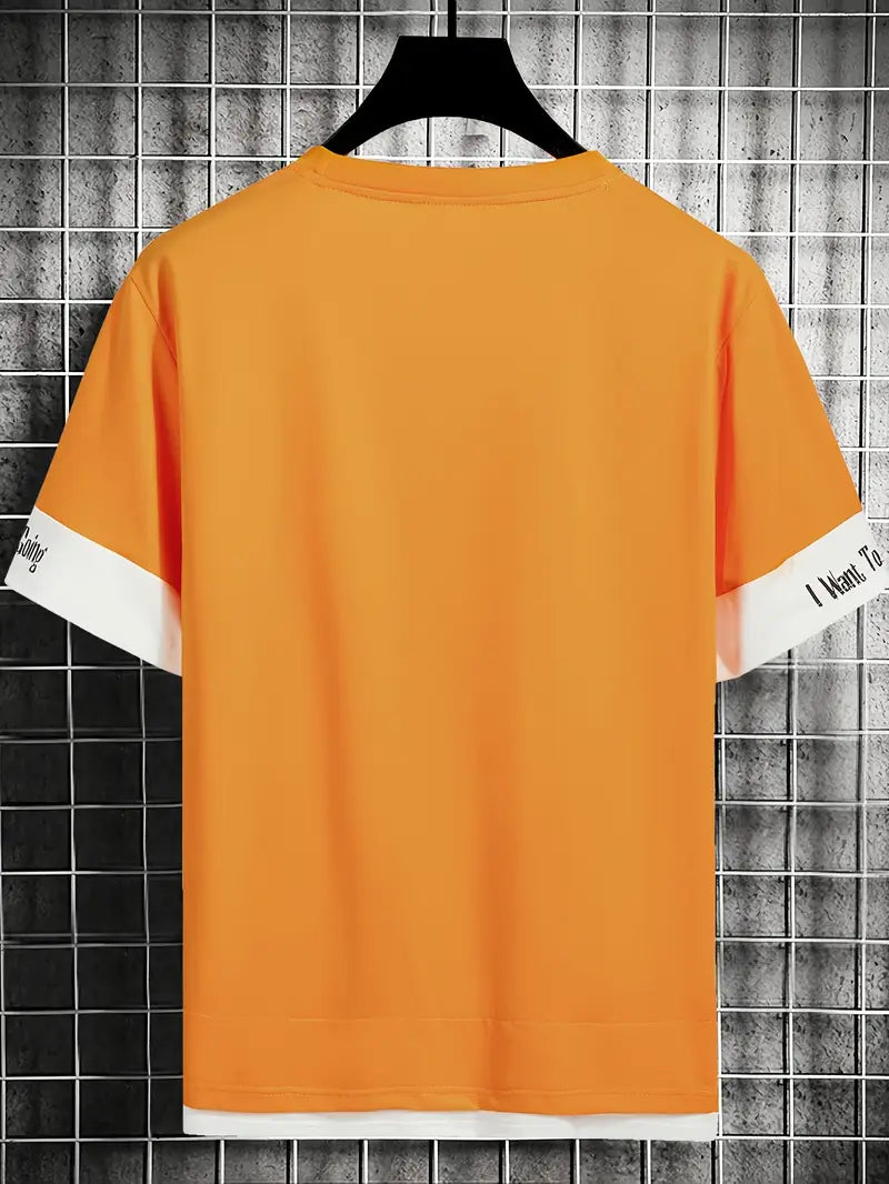 Men's Color-Blocked Short Sleeve T-Shirt with Letter Print Faux Two-Piece Summer Casual