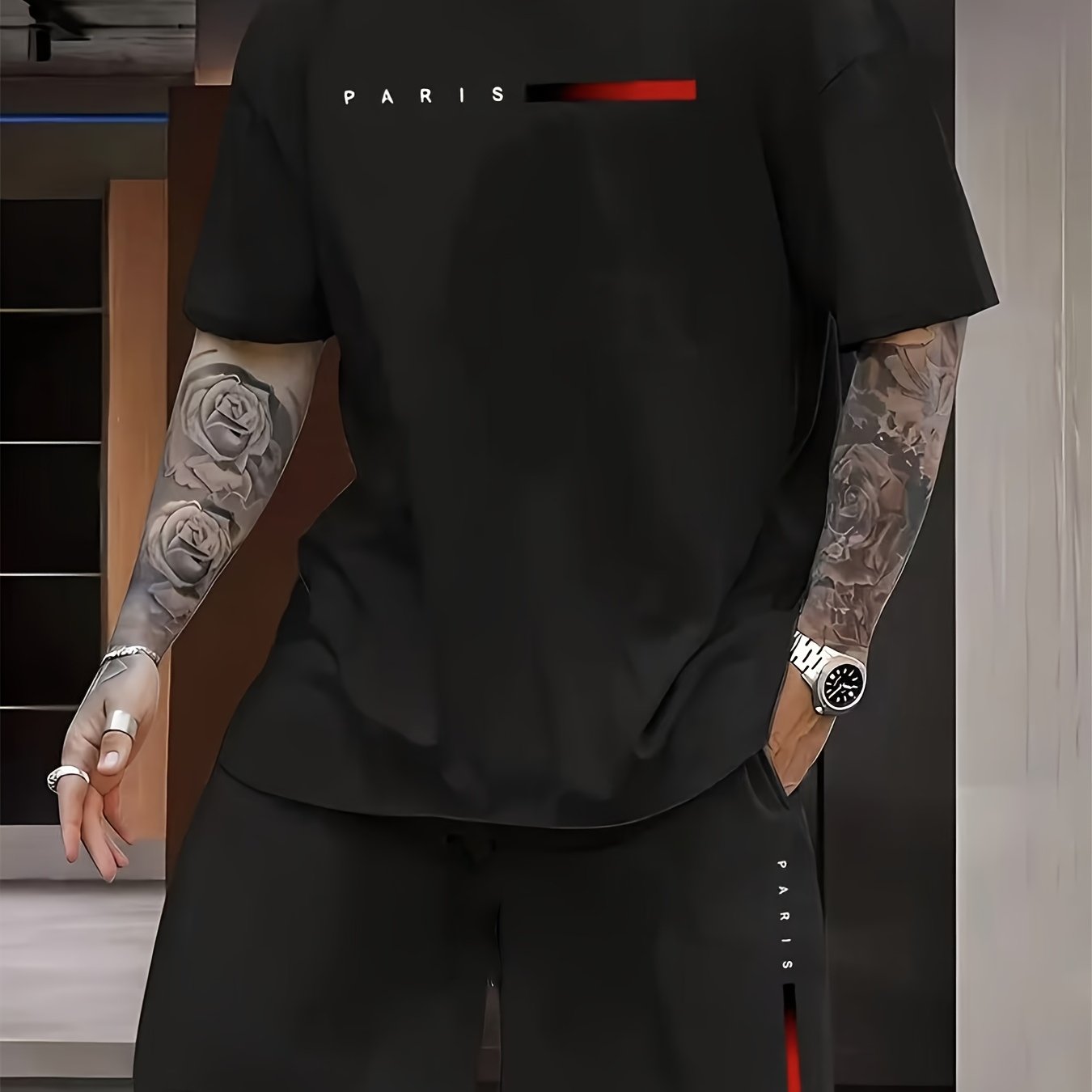 Men's Short-Sleeve Pajama Set with Geometric Pattern Polyester Spandex for All Seasons