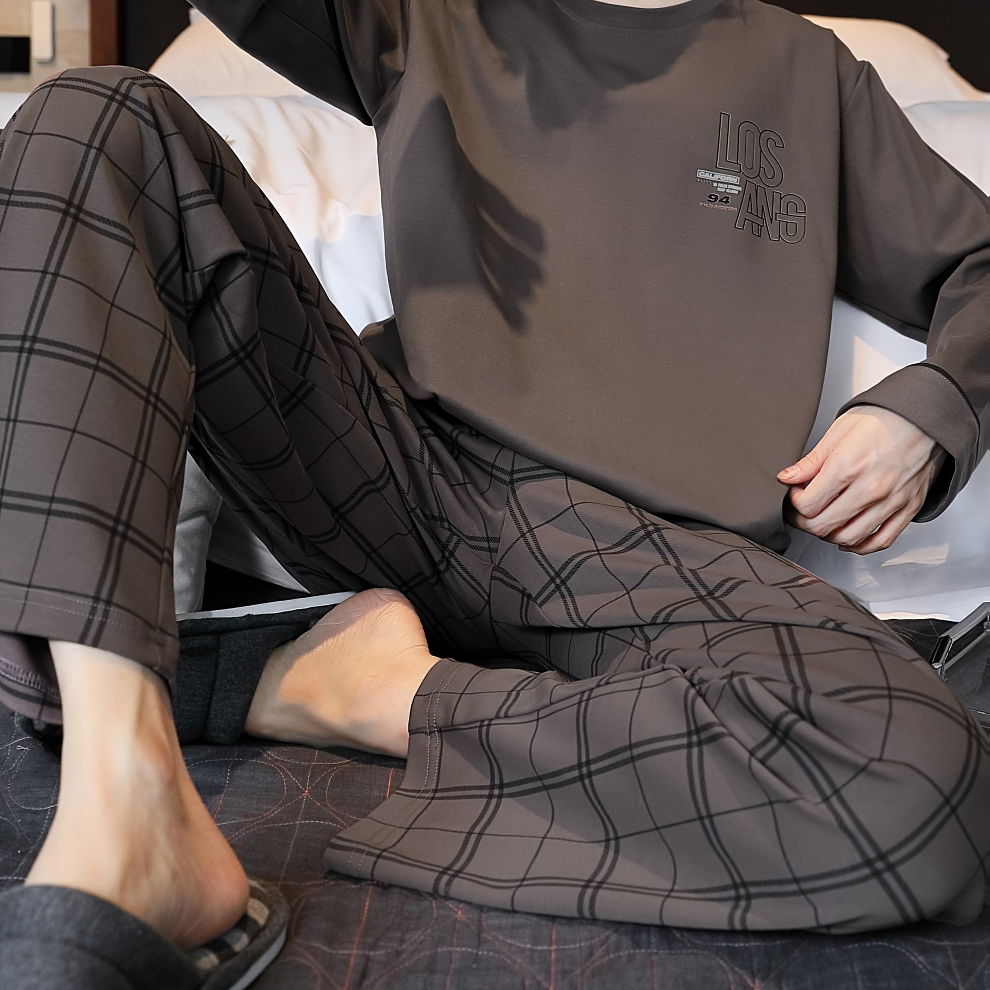 Men's Plaid Pajama Set Polyester Knit Long Sleeve Crew Neck Sleepwear Loungewear