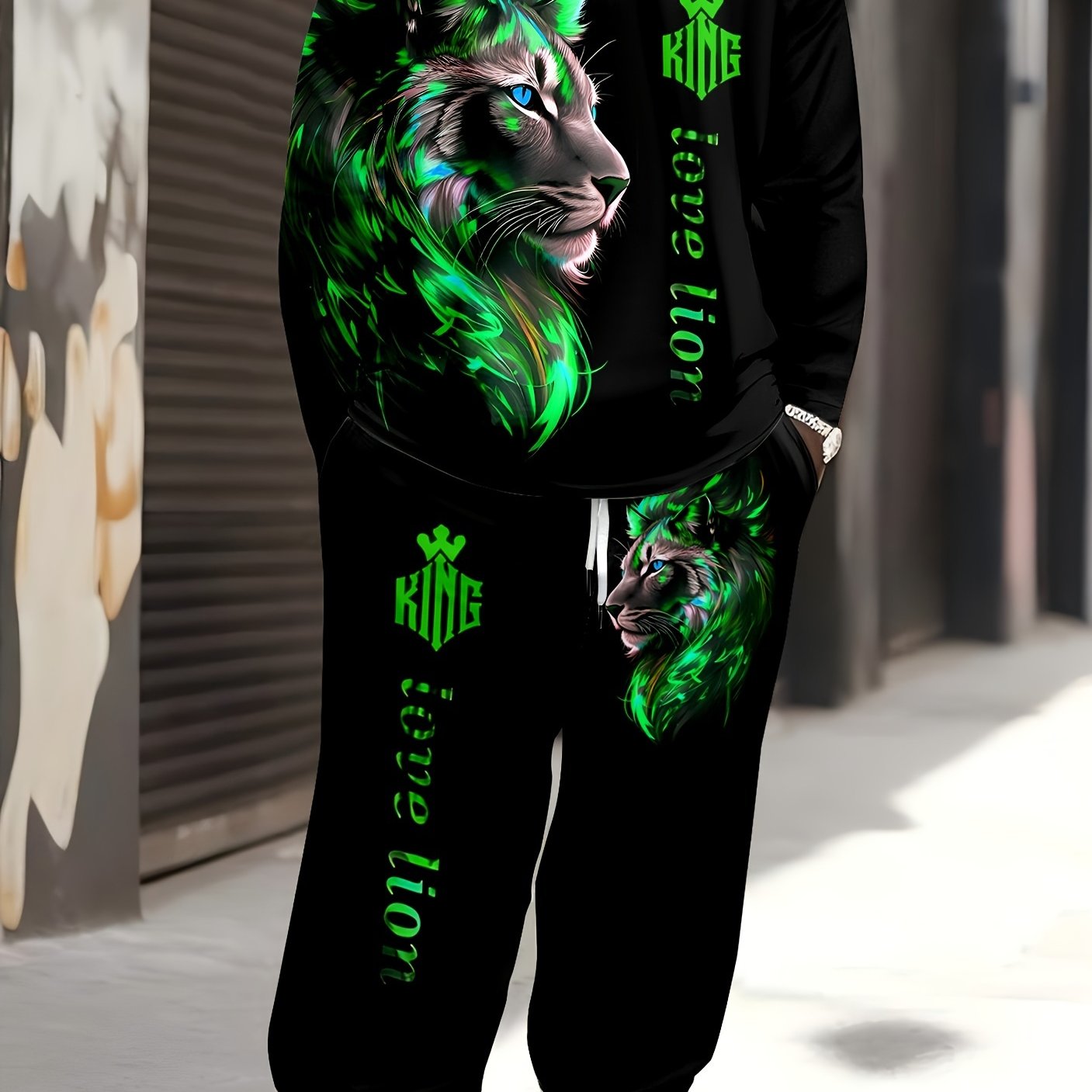 Men's Plus Size Lion Print Long Sleeve T-Shirt and Sweatpants Set Casual Sportswear for Fall Winter