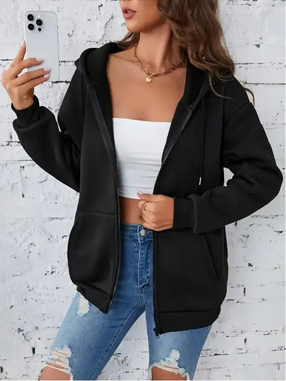 Plus-Size Cartoon Print Zip-Up Hoodie with Pockets and Drawstring for Spring Summer Fall