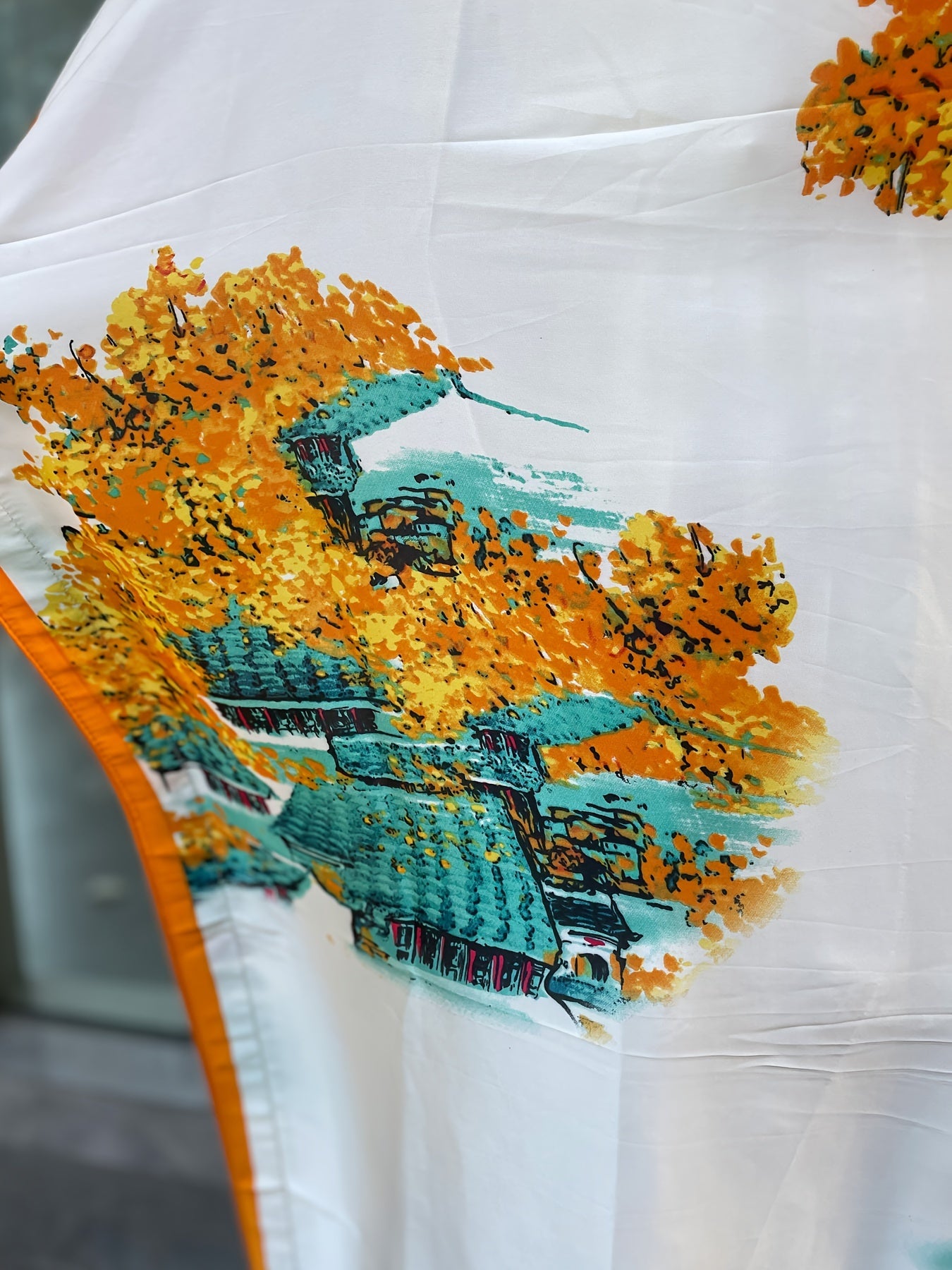 Plus Size Floral Print Longline Dress Polyester Batwing Sleeves Tassel Scarf