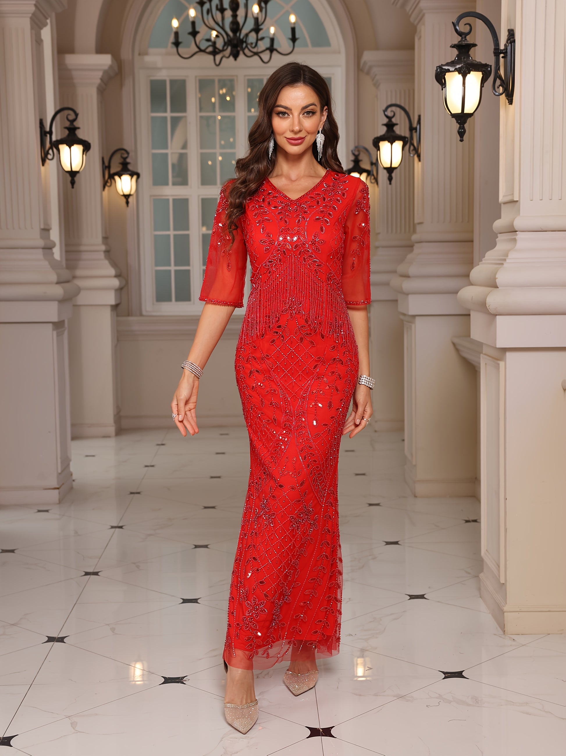 Plus Size Long Sleeve Red Sequin V-Neck Mermaid Dress for Women