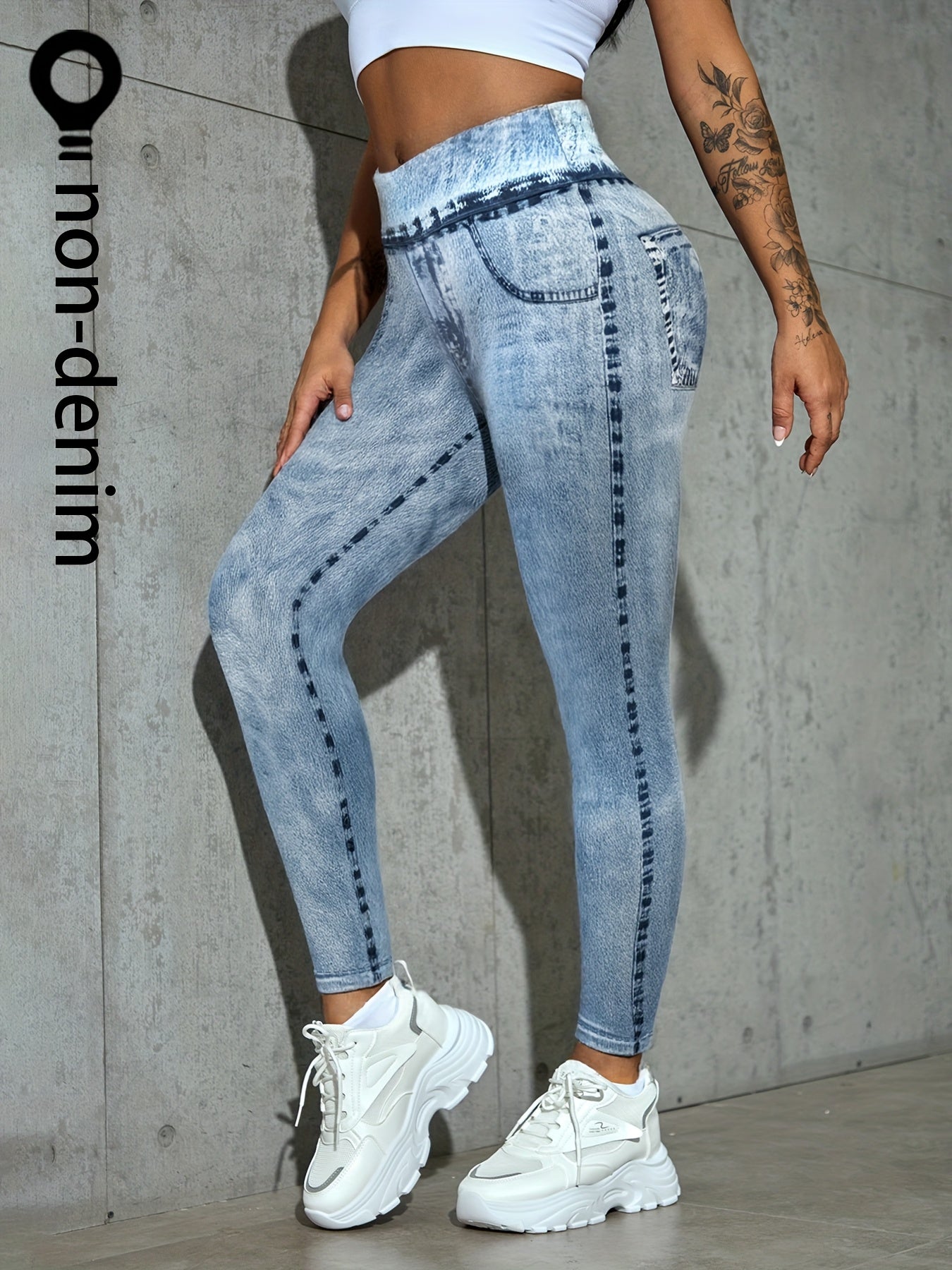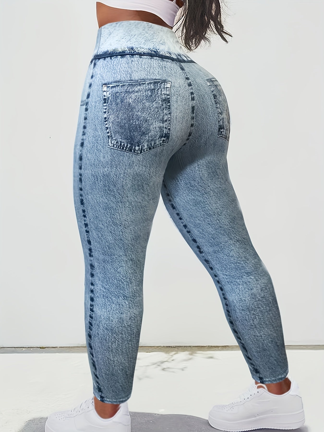Plus Size Women's Faux Denim Print Leggings Comfort Fit Stretch Jeggings