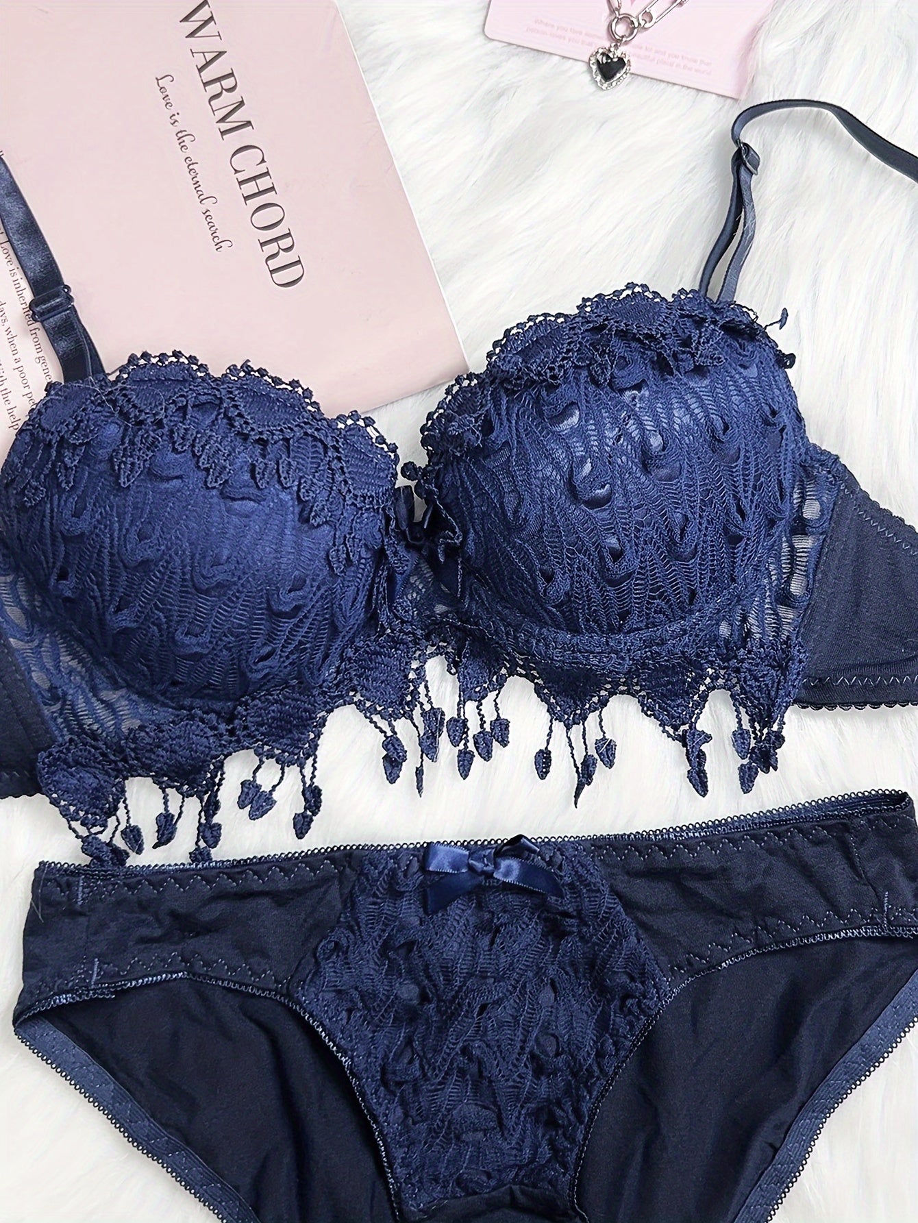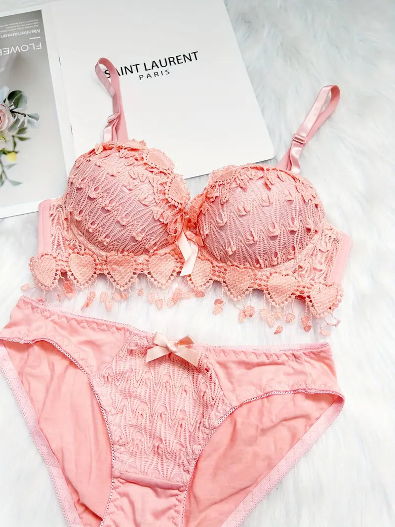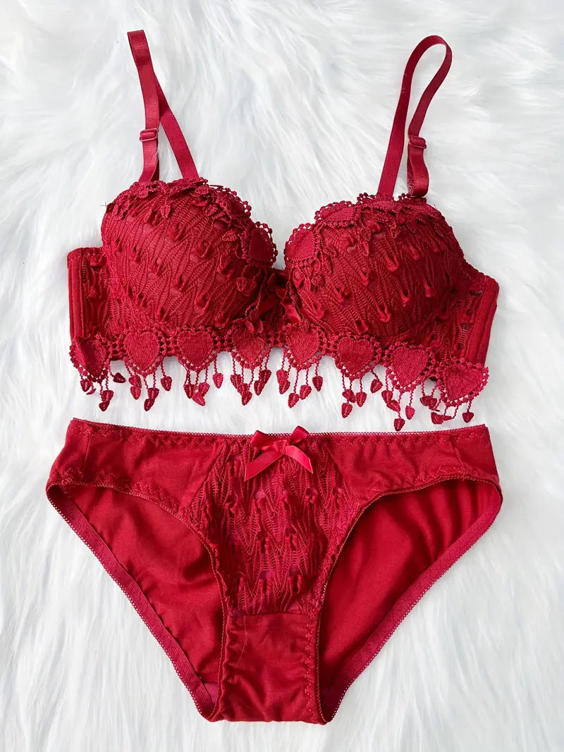 Women Red Heart Embroidery Lingerie Set with Push-Up Bra and Removable Pads
