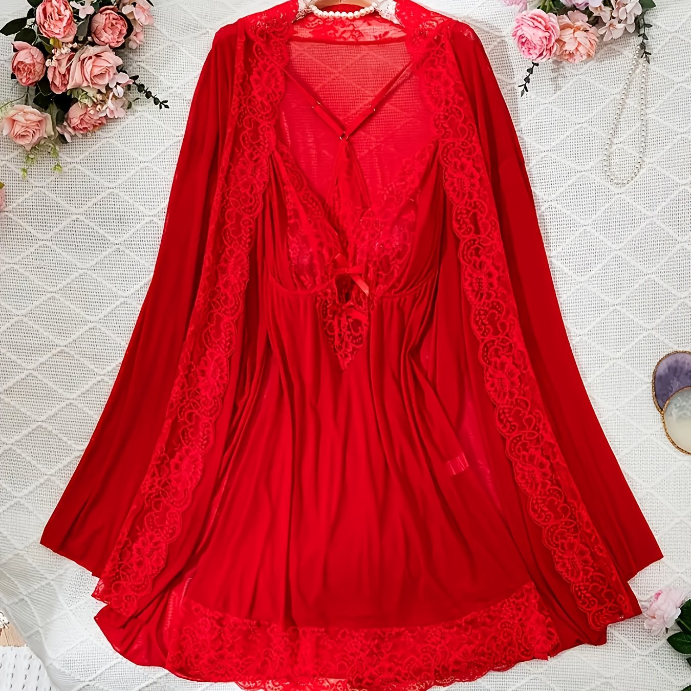 Red Semi-Sheer Lace Garter Lingerie Set for Women