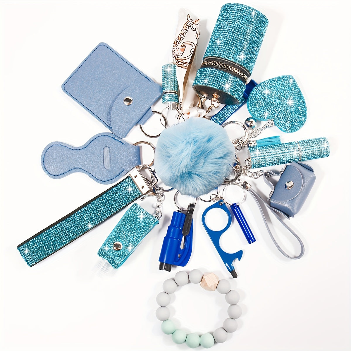 Set of 15 Rhinestone Safety Keychains with Wristlet, Pouch, Pom Pom Card Holder and Accessories