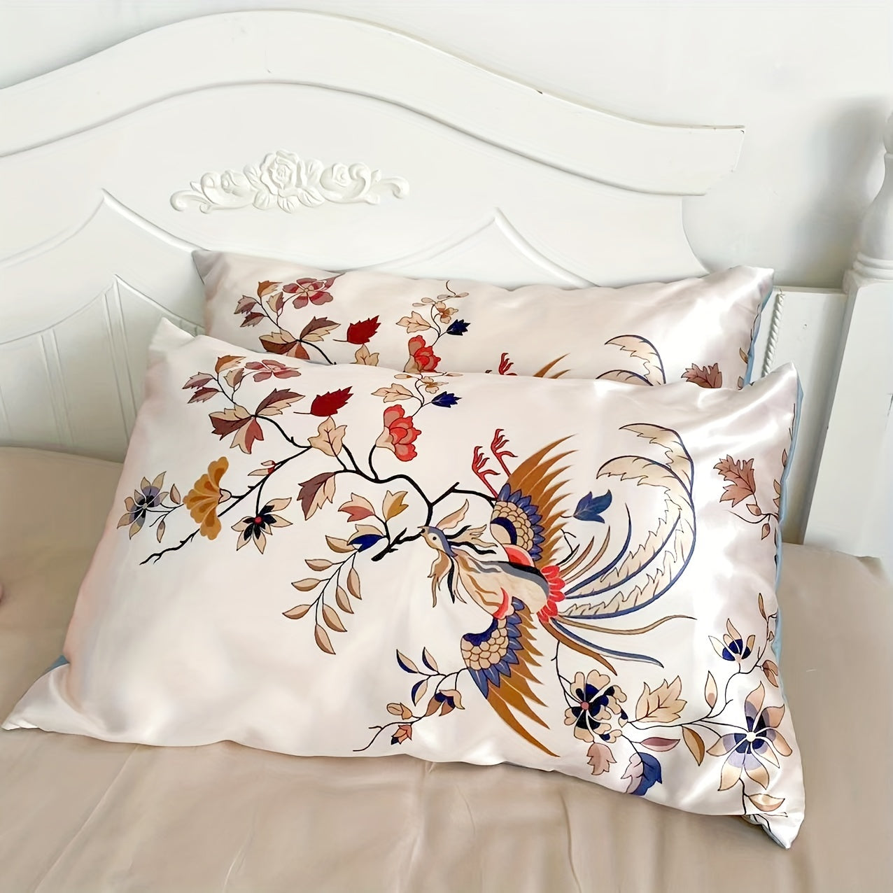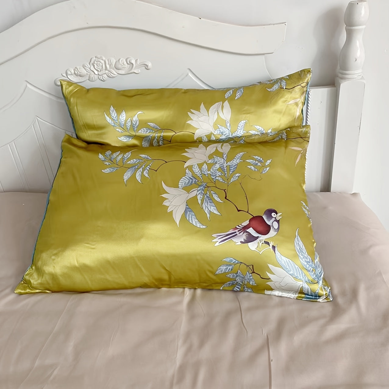 Set of 2 Satin Pillowcases with Floral Bird Patterns Reversible Envelope Closure