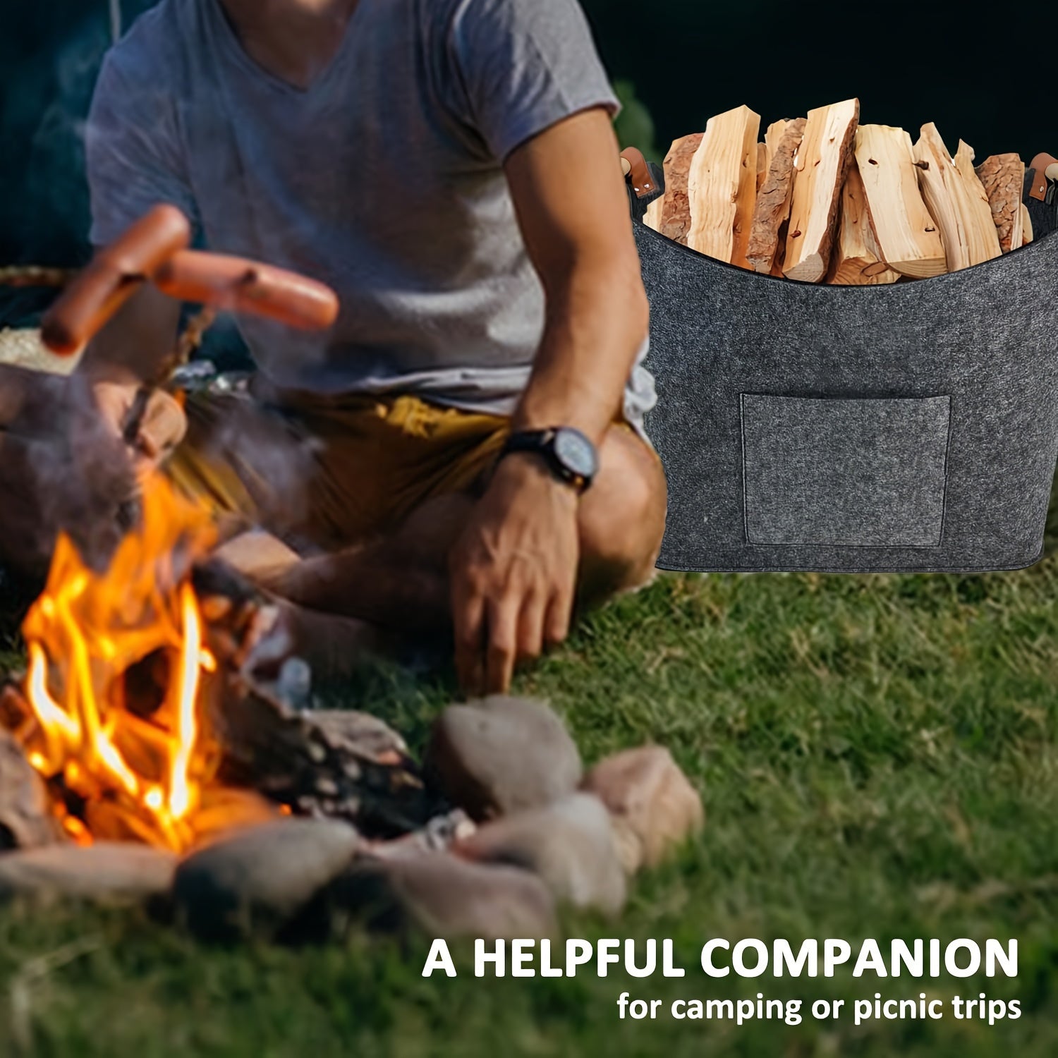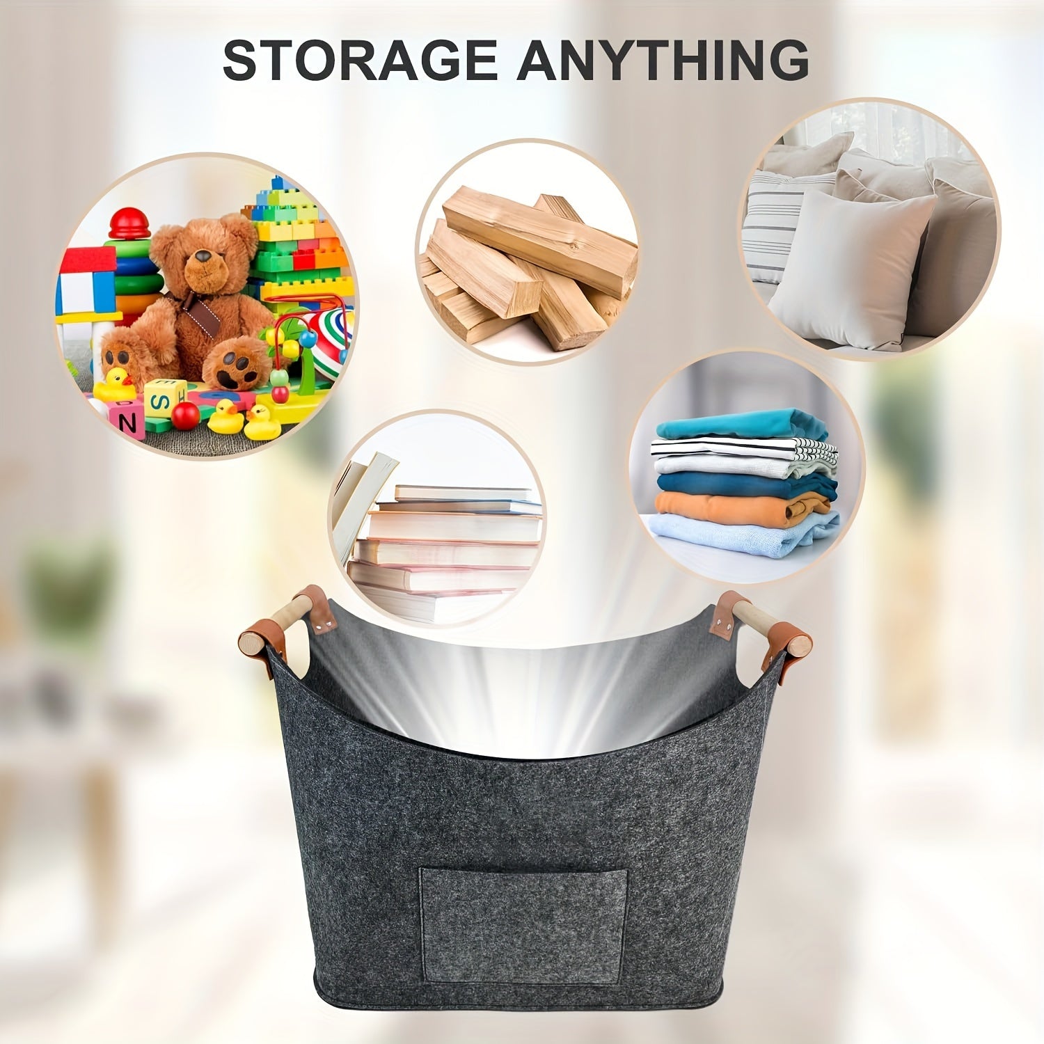 Set of 2 Large Firewood Baskets with Wooden Handles, Dark Gray Felt Storage