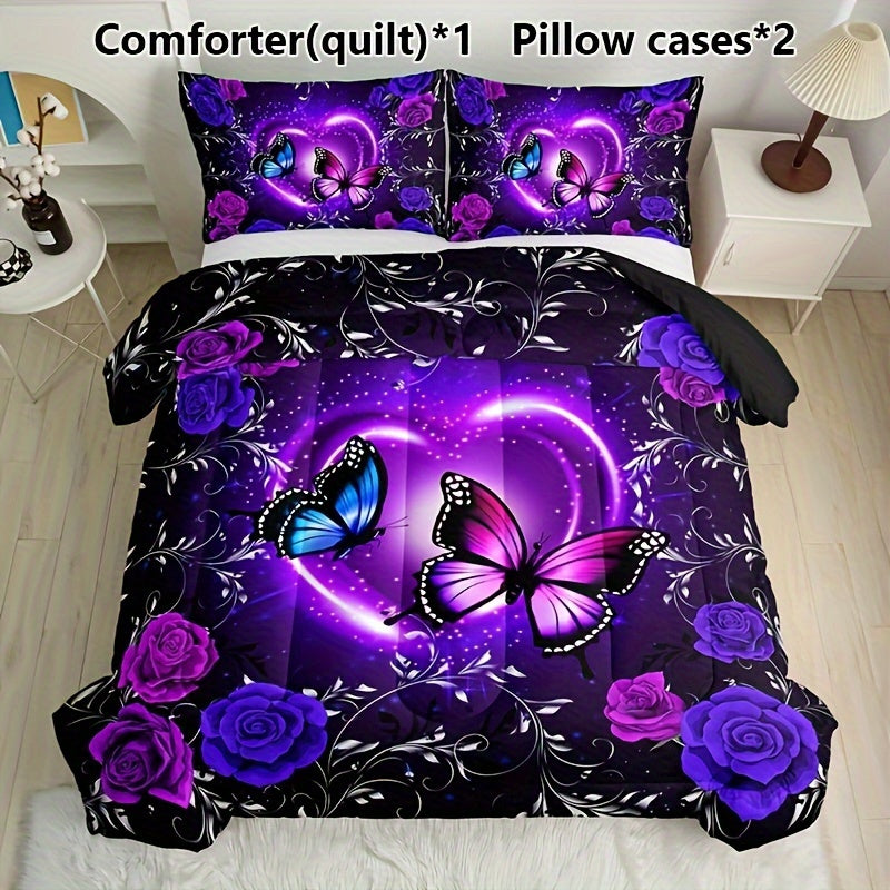Set of 3 Purple Butterfly Floral Quilt Bedding Set with Pillowcases All Season Soft Breathable