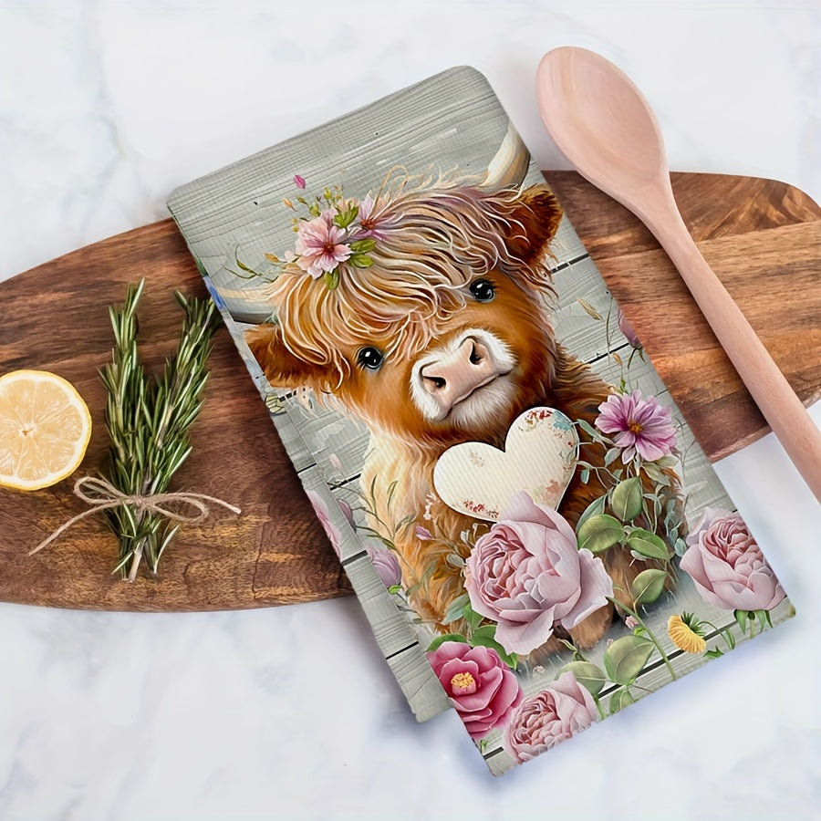 Set of Two Colorful Sunflower Cow Pattern Kitchen Towels for Farmhouse Style Kitchen or Bathroom