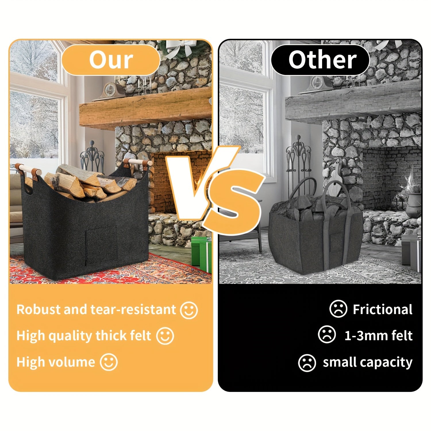Spacious 55L Wooden Log Basket with Felt, Foldable Firewood Holder, Dark Gray