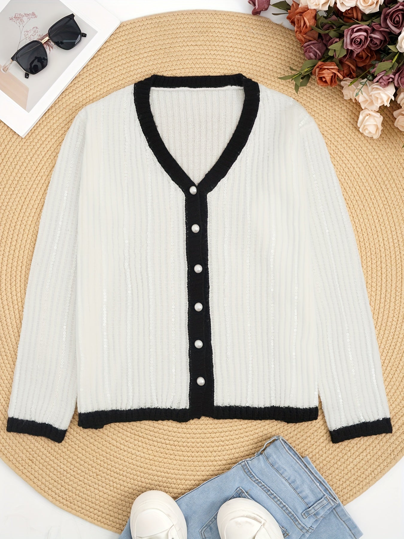 Women's Beaded Knit Cardigan Fall Winter Solid Color Crew Neck Casual