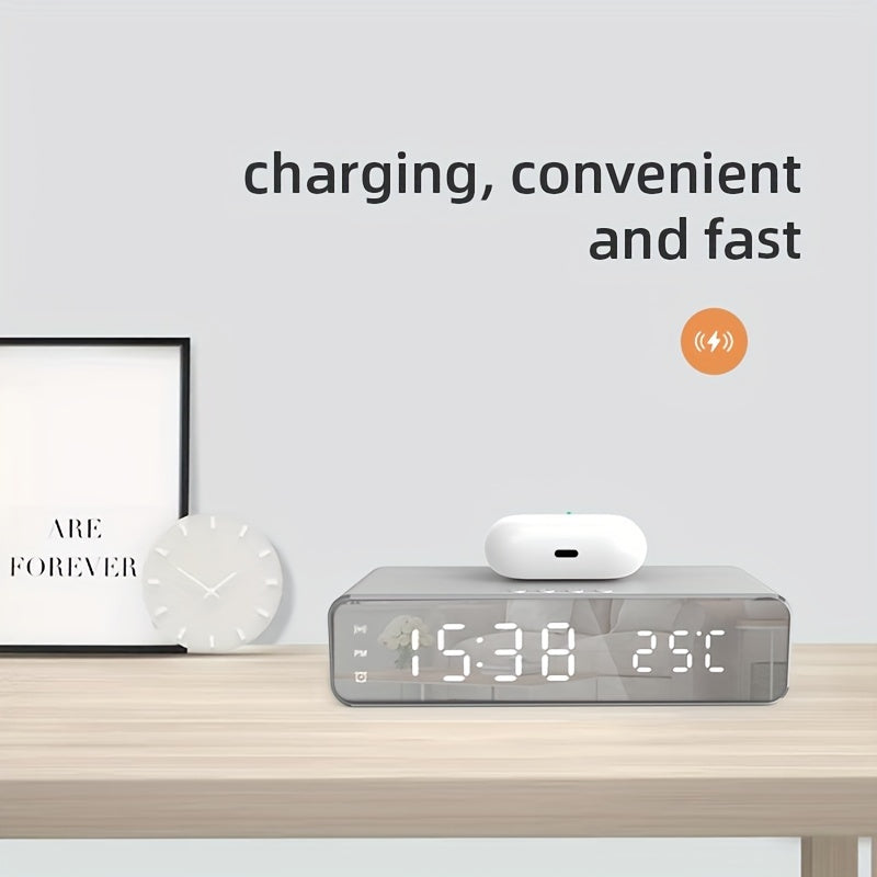 Wireless Charging Station with Alarm Clock Thermometer and Earphone Holder