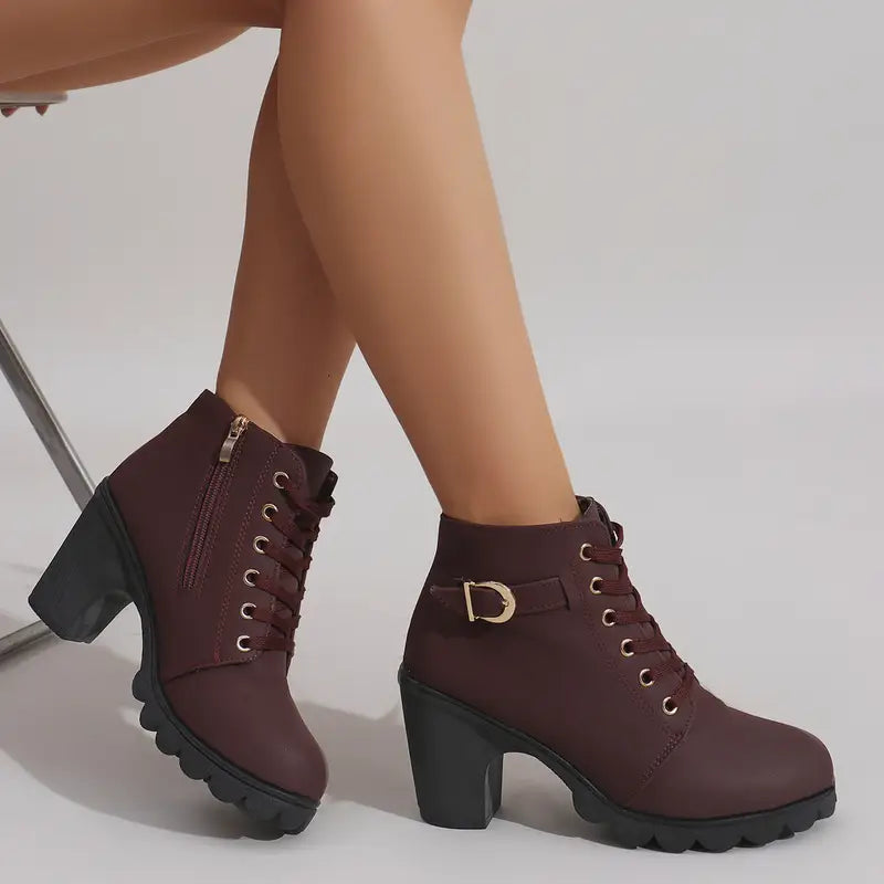 Women Ankle Boots Winter Thick Sole Side Zipper Lace-Up Casual Black Synthetic