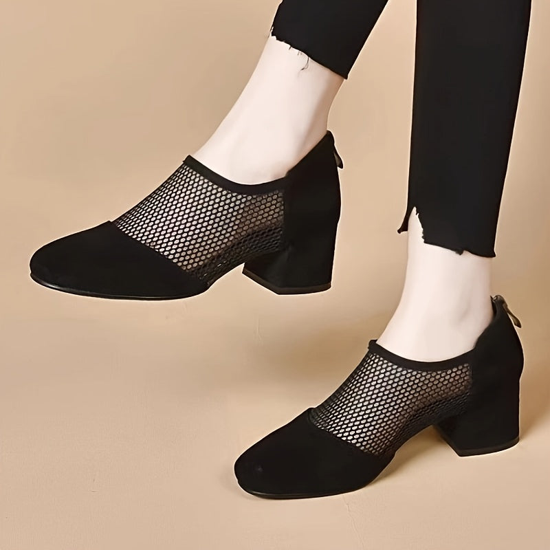 Women Mesh Sandals with Thick Heel and Zipper Closure Black