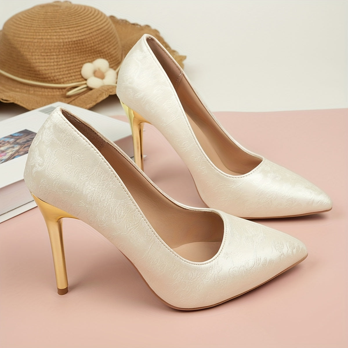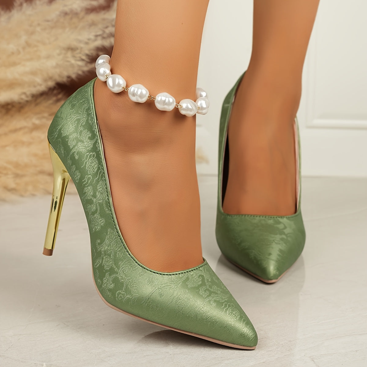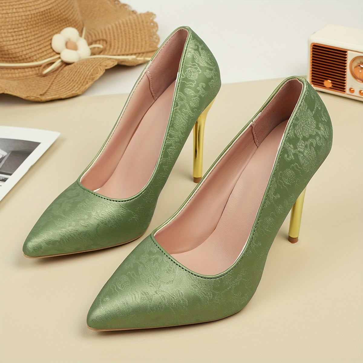 Women's Black Floral Embossed Pointed Toe High Heels with Gold Accents