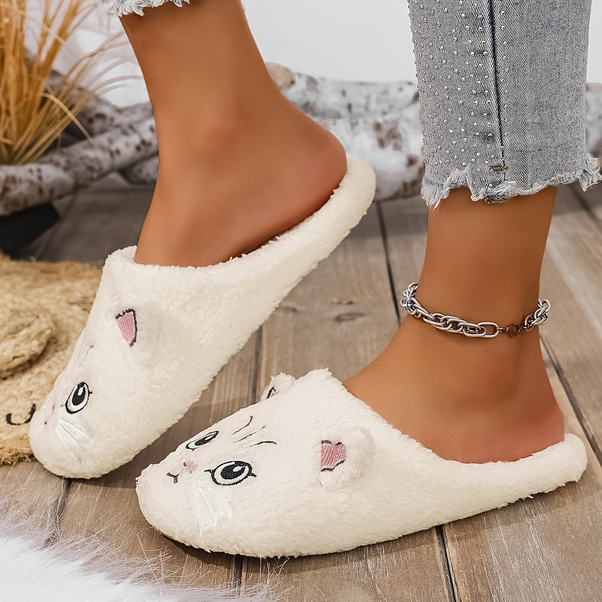 Women's Cartoon Cat Slippers Soft Plush Non-Slip Indoor House Shoes Grey Black