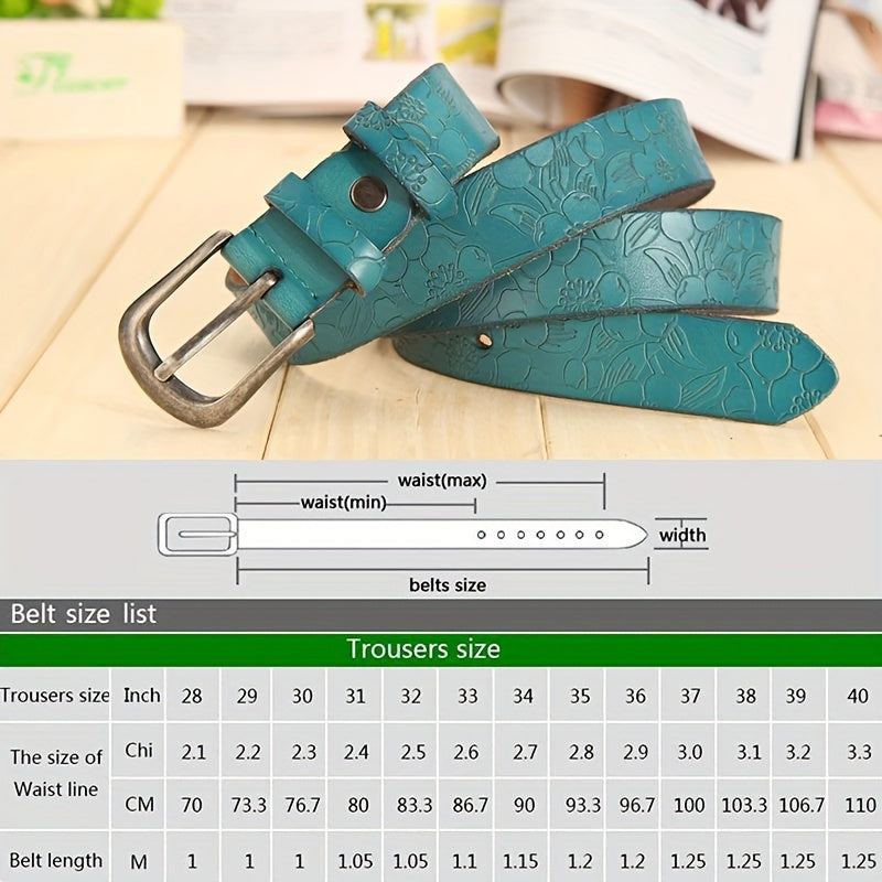 Women's Leather Flower Embossed Belt with Vintage Pin Buckle for Casual Jeans