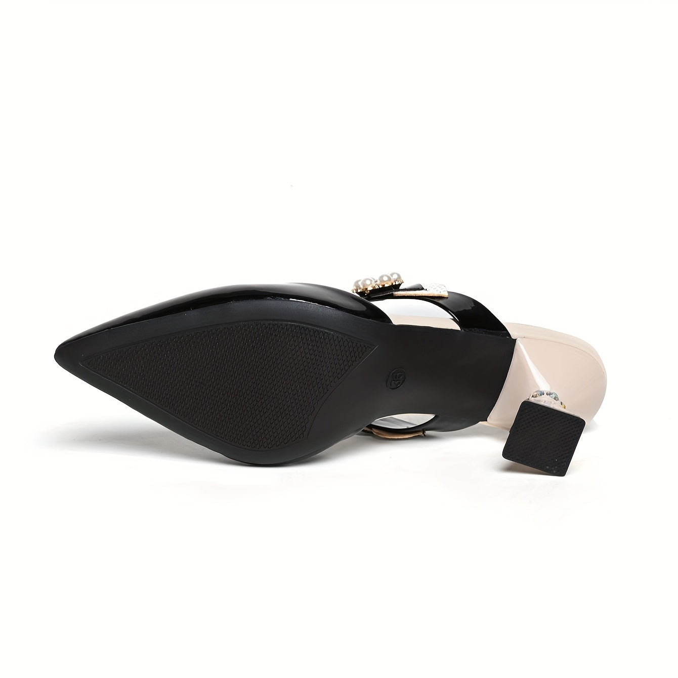 Women's Faux Pearl Heart Strap Dress Sandals Slip-On Chunky Heel Point Toe