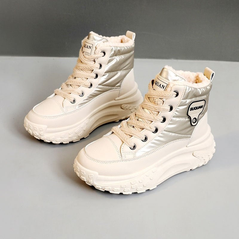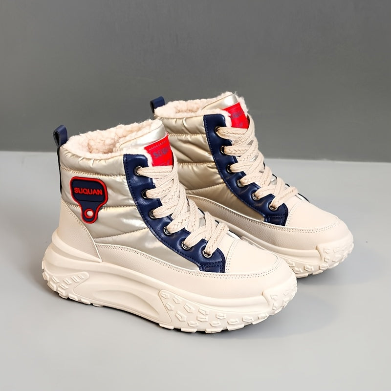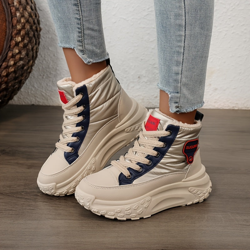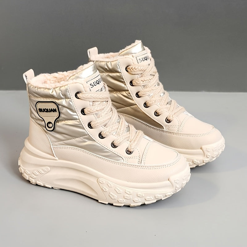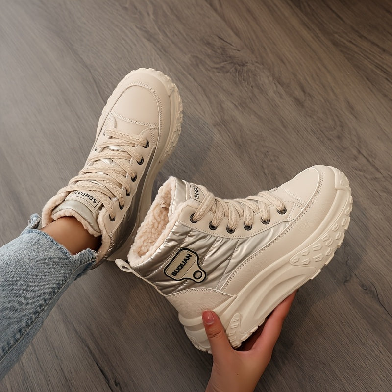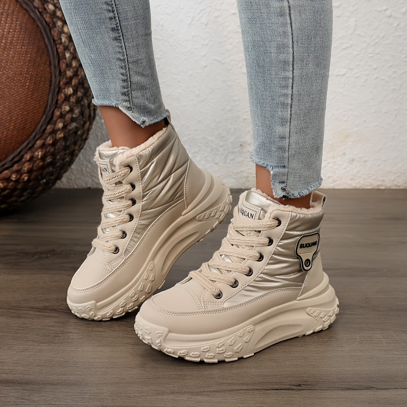 Women's Fleece-Lined Platform Ankle Boots Winter Casual Lace-Up Black Brown Beige
