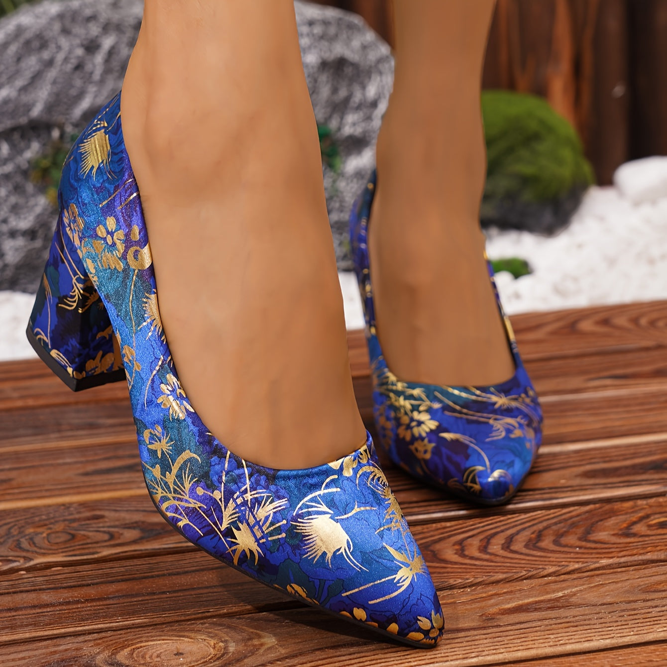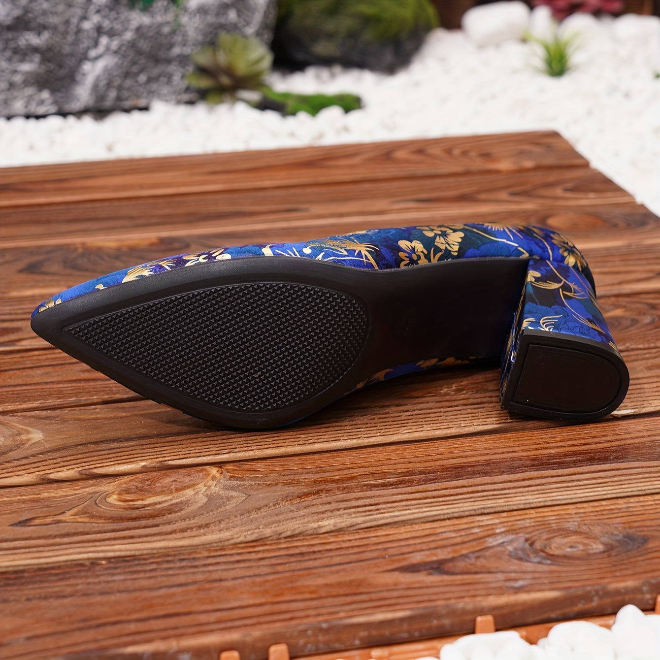 Women's Floral Mary-Jane Pumps with Pointed Toe Block Heel