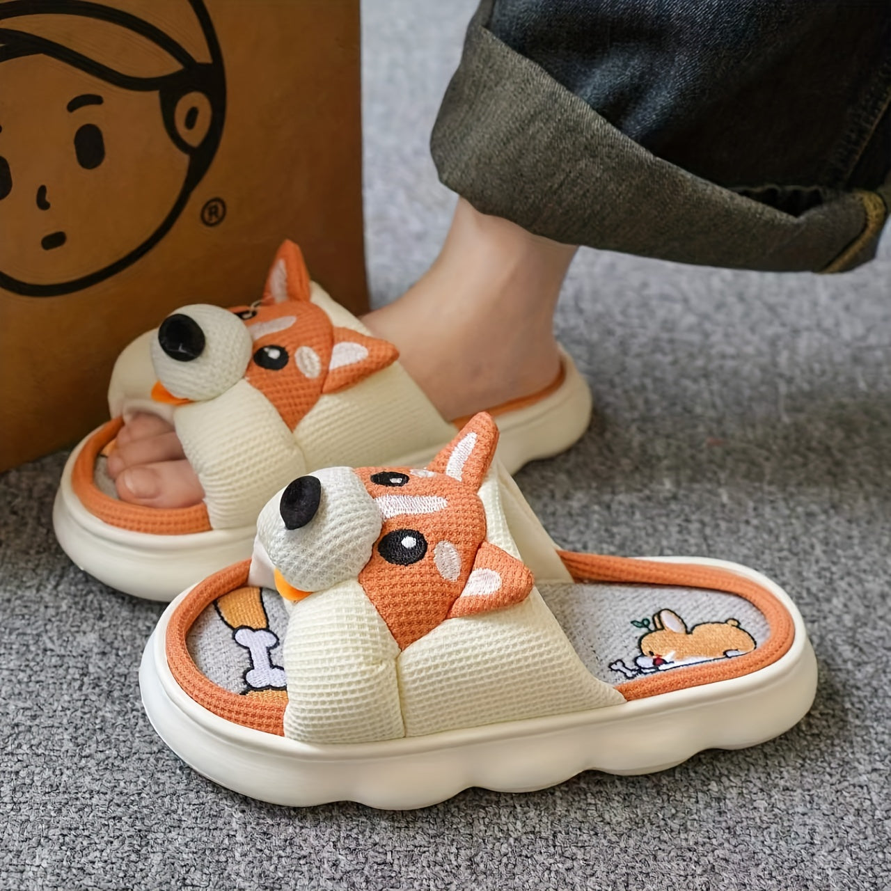 Women’s Linen Open Toe Slippers with Cute Dog Design Indoor Comfort