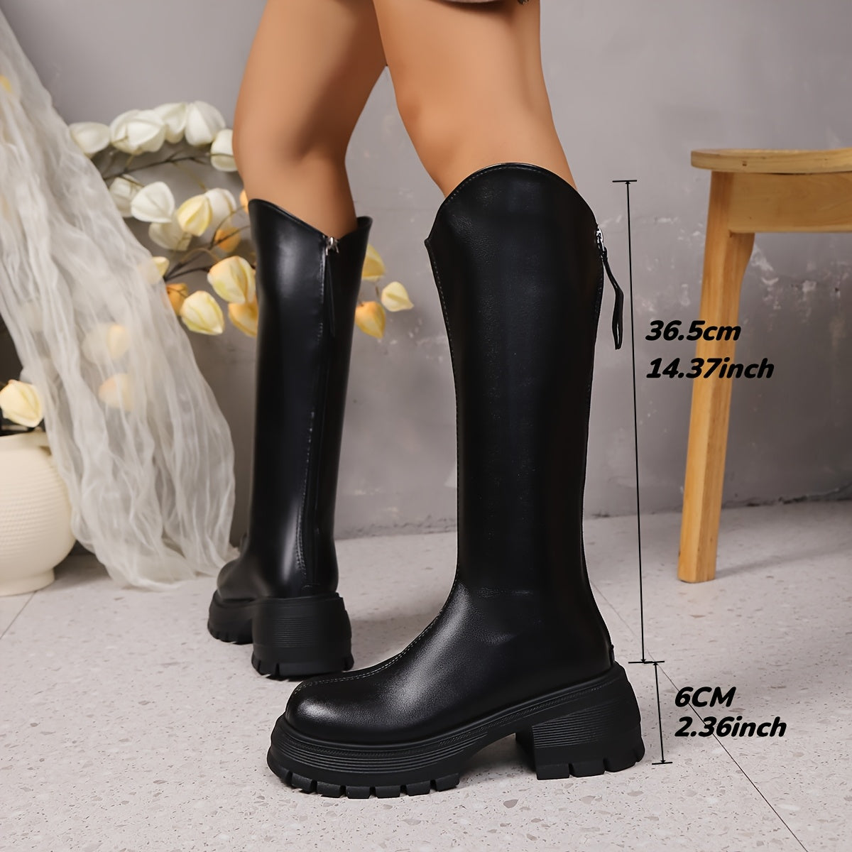 Women's Mid-Calf Synthetic Leather Boots with Zipper and Thick Sole