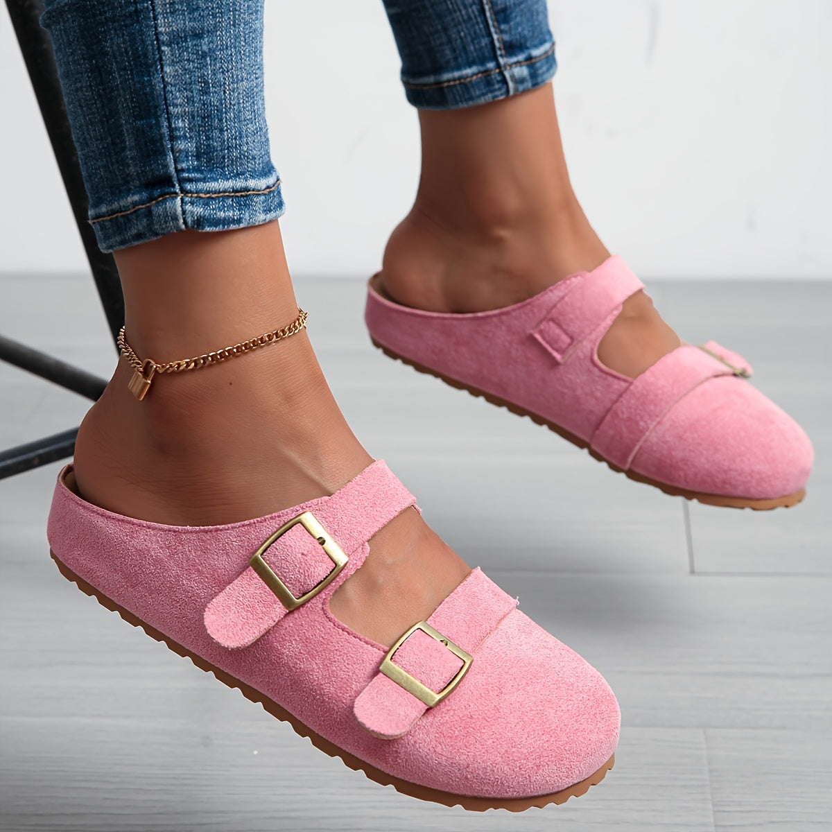 Women's Pink Slip-On Mules with EVA Sole and Gold Buckle Straps