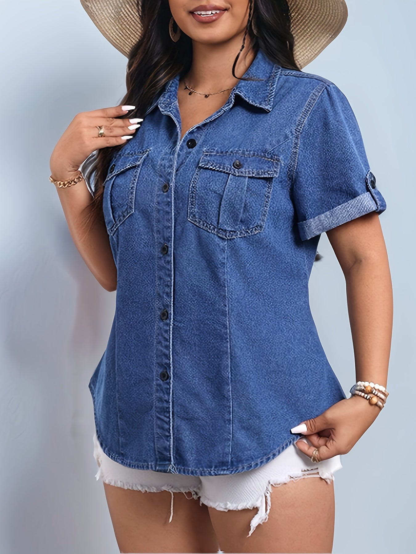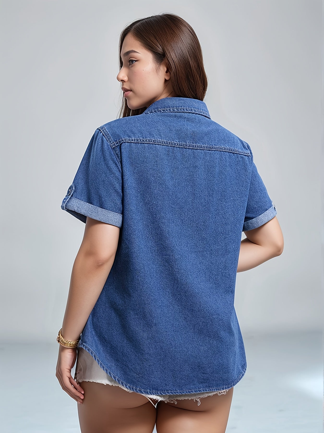 Women's Plus Size Denim-Style Button-Up Blouse with Flap Pockets