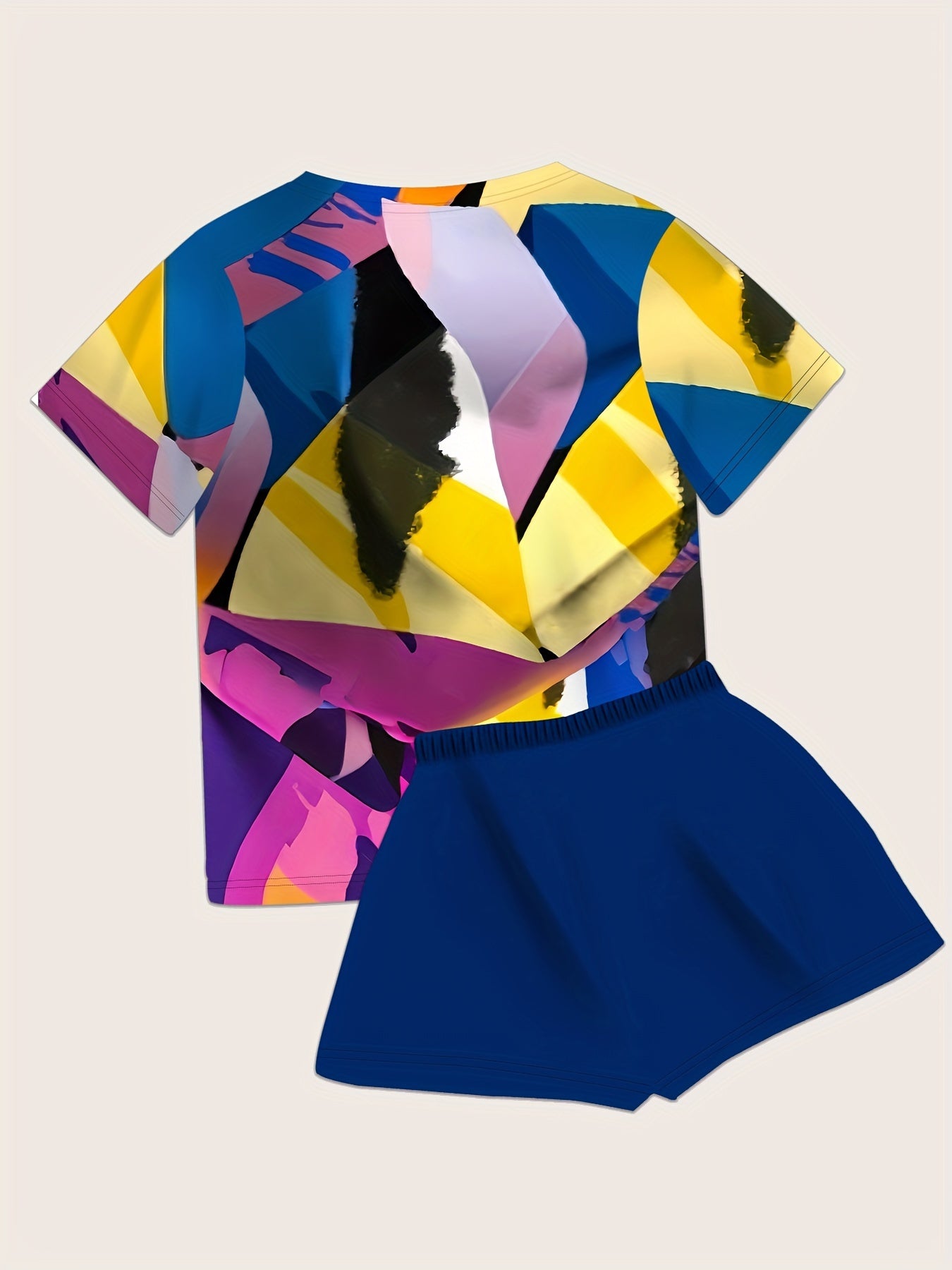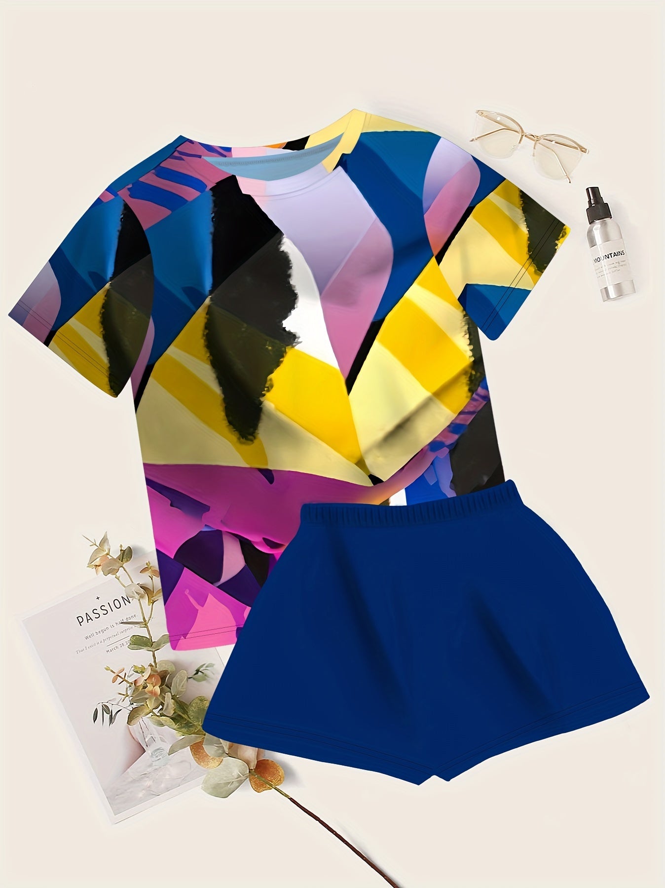 Women's Plus Size Geo Print Lounge Set Short Sleeve Crew Neck Top and Shorts Pajama