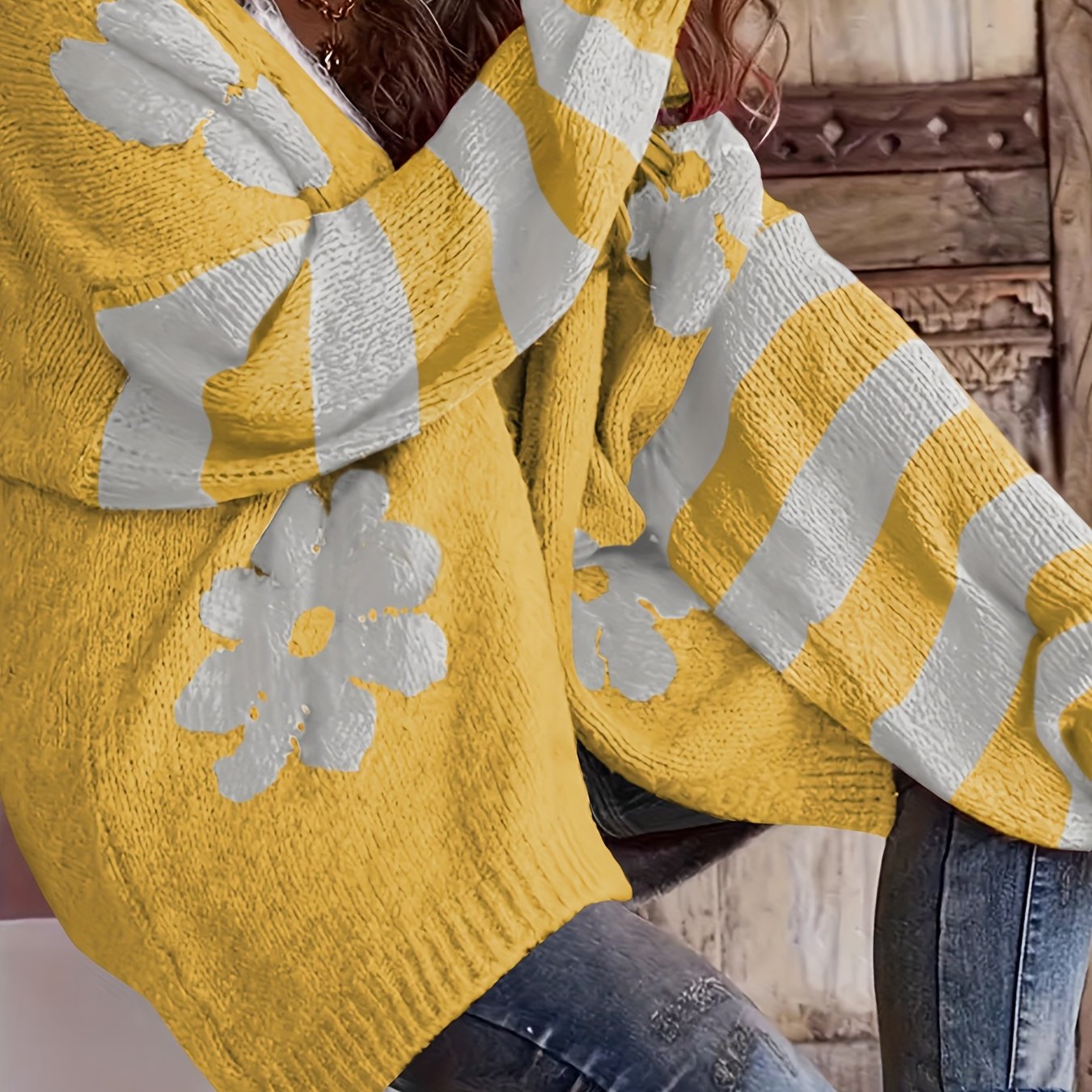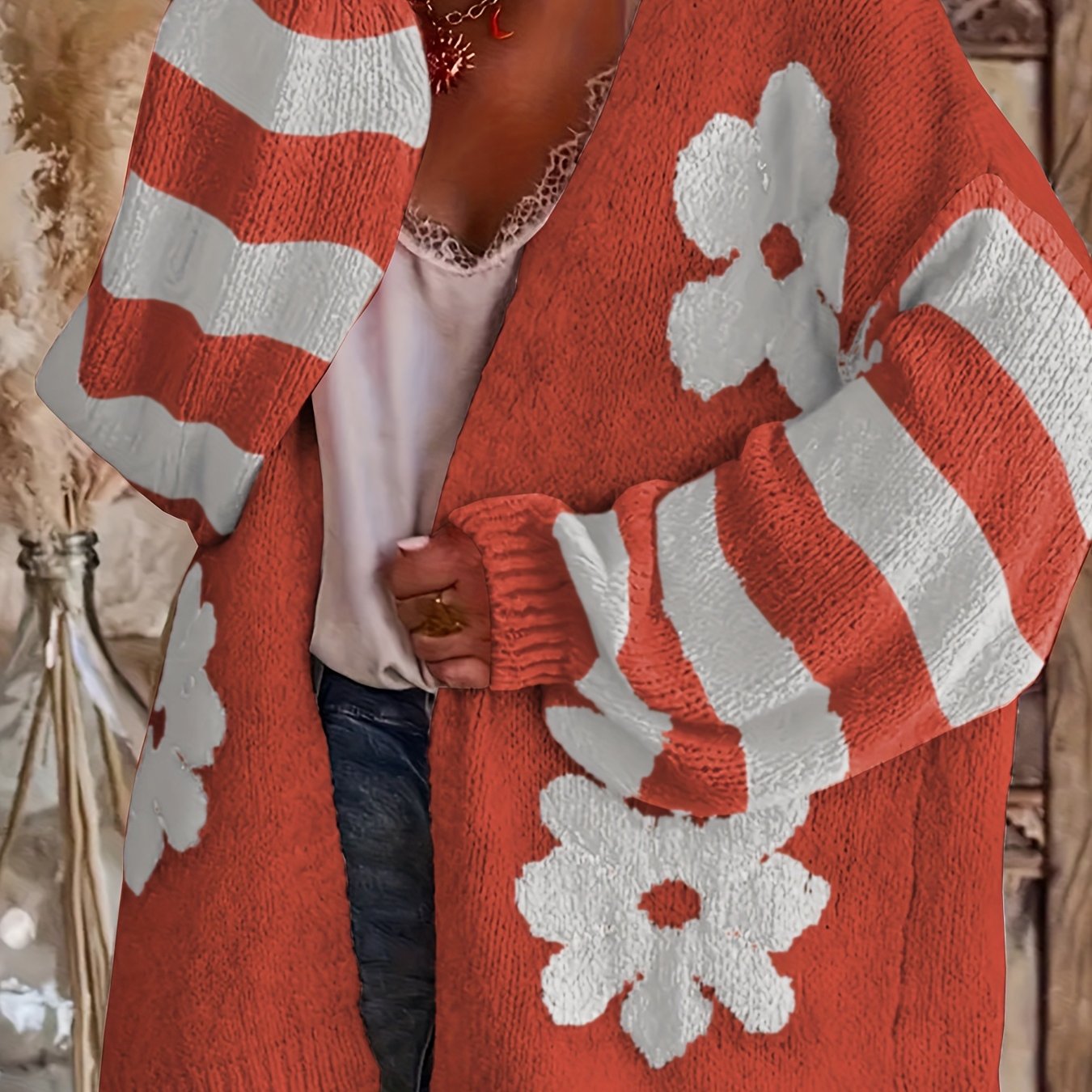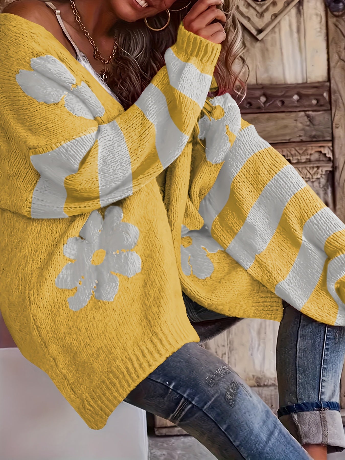 Women's Plus Size V-Neck Floral Print Knit Cardigan Long Sleeve Sweater