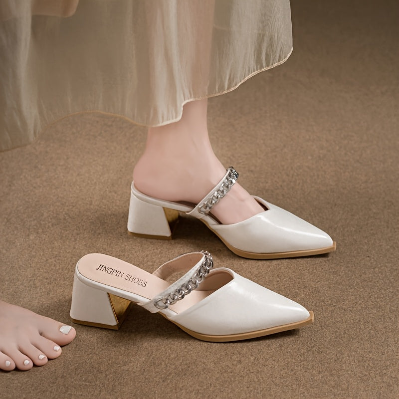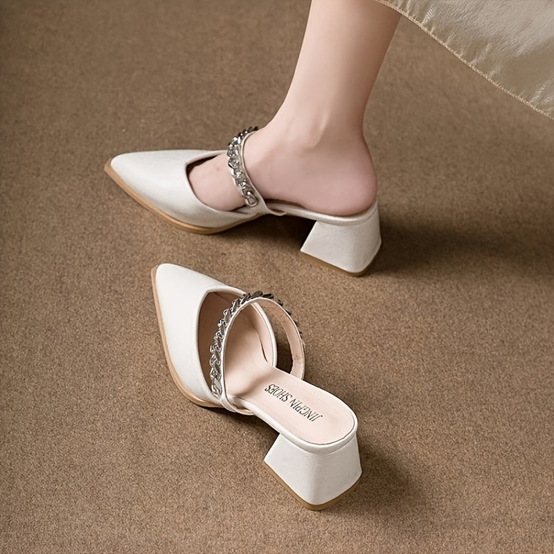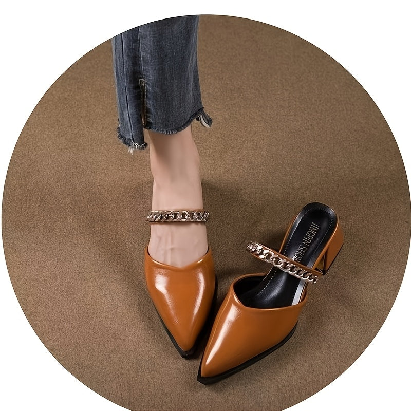 Women's Pointed Toe Chunky Heel Shoes Synthetic Braided Ankle Strap Black Brown