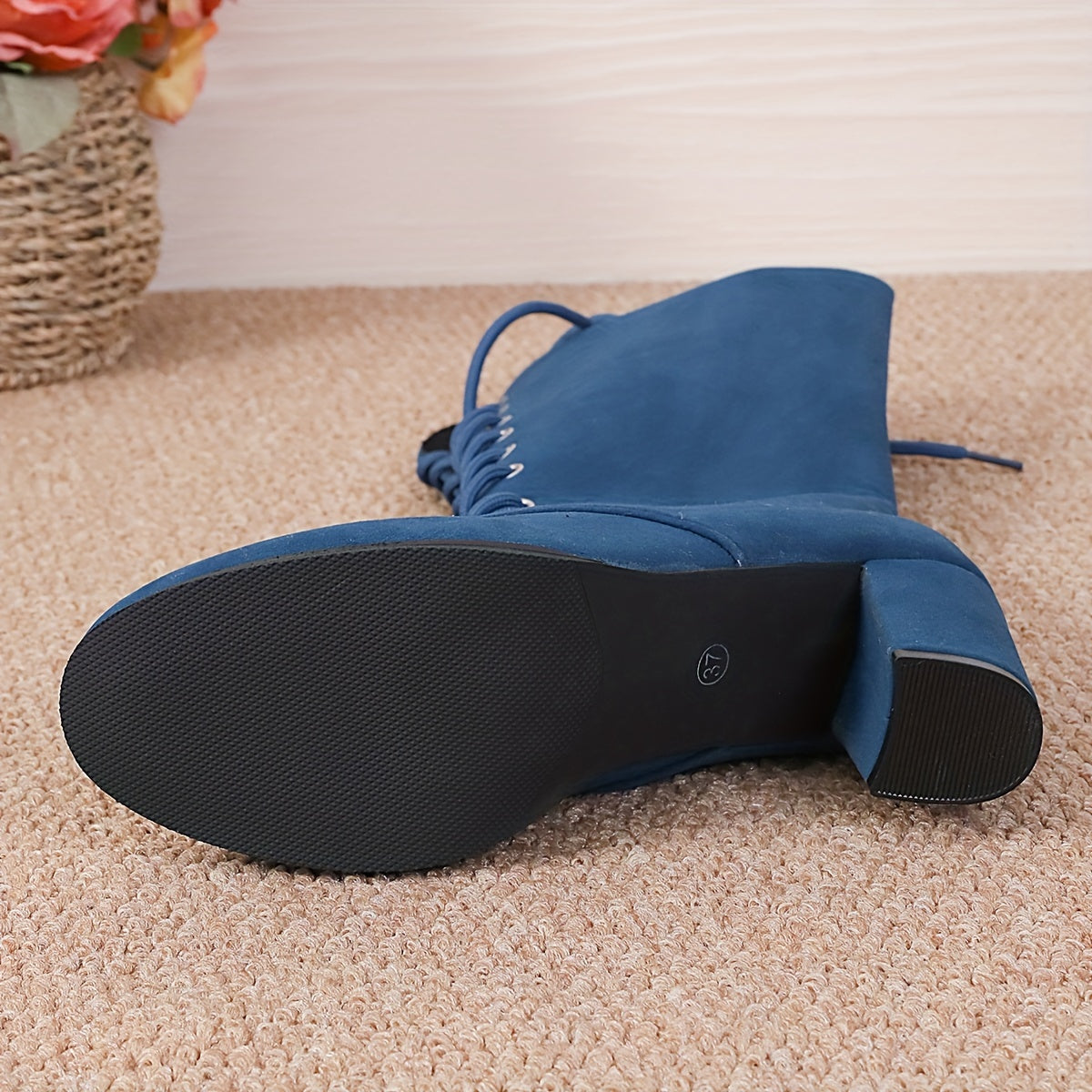 Women's Solid Color Lace-Up Mid-Calf Winter Boots with Chunky Heels