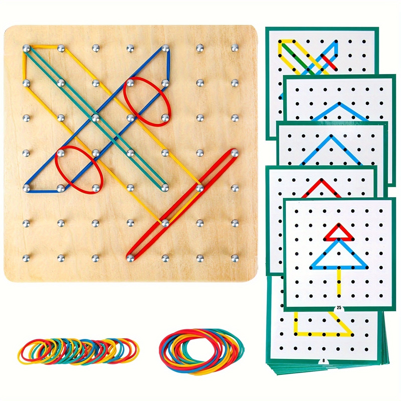 Educational Wooden Geometric Board Set for Kids Ages 3-6 with Pattern Cards and Rubber Bands