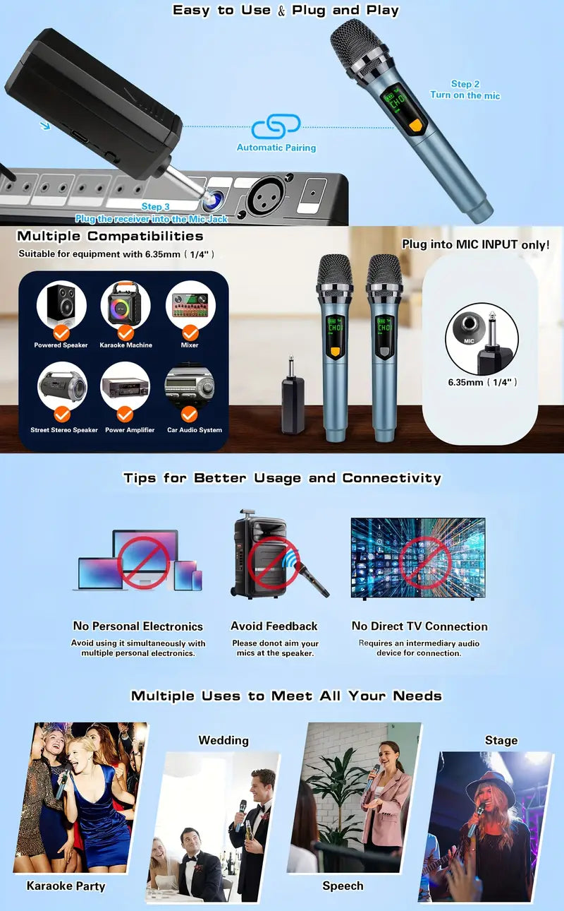 Gray Wireless Microphone Pair with Volume Control and 6.35mm Jack