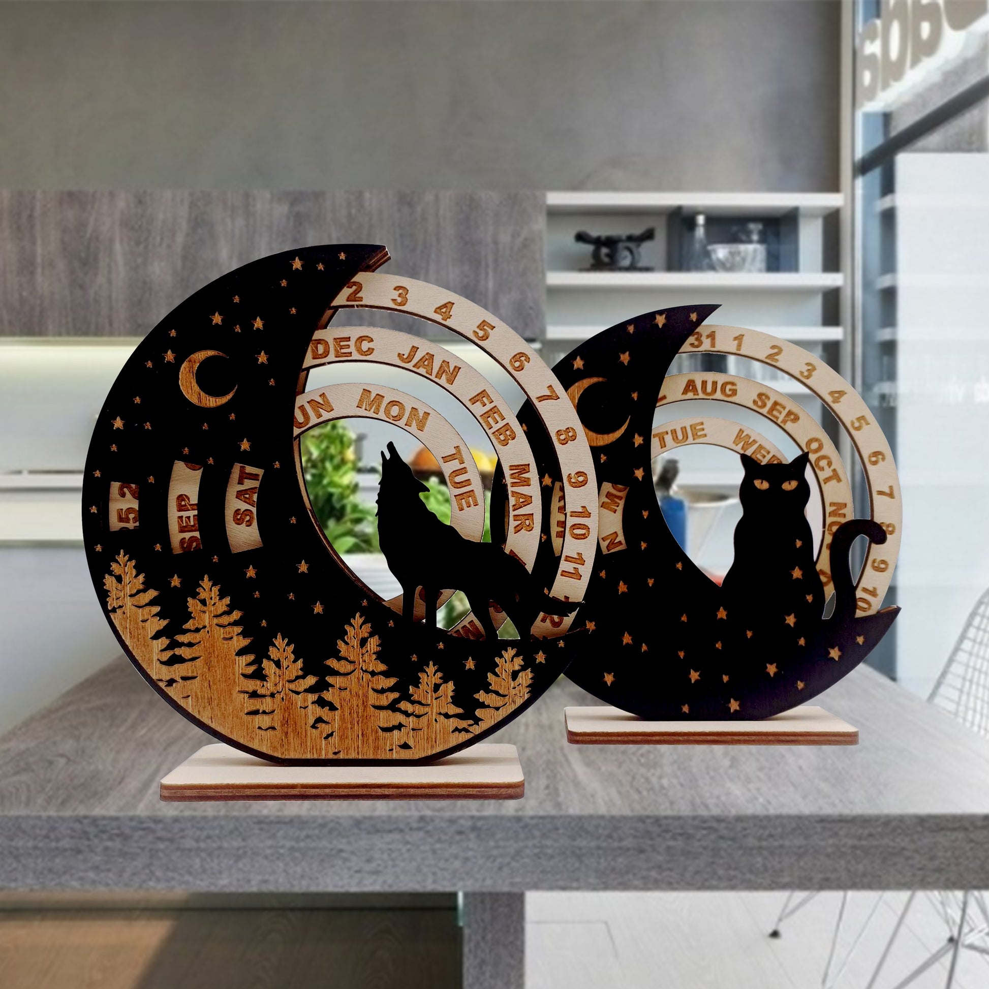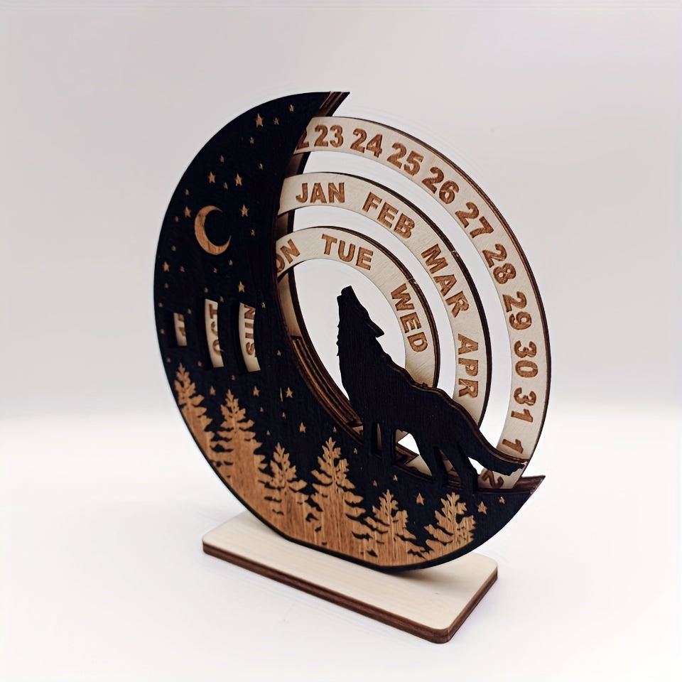 2023 Rustic Wooden Wall Calendar Wolf and Cat Design No Electricity Needed Holiday Decor