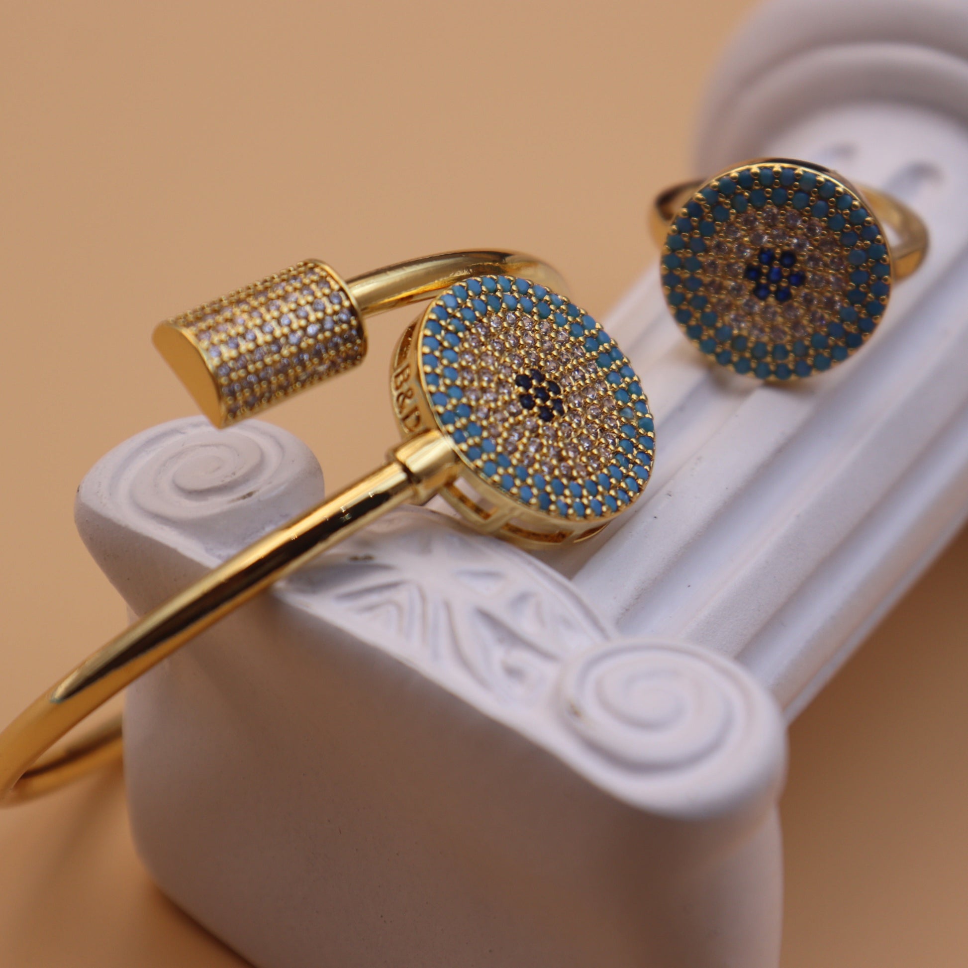 Gold Plated Bangle with Turquoise Inlay and Ring for Women