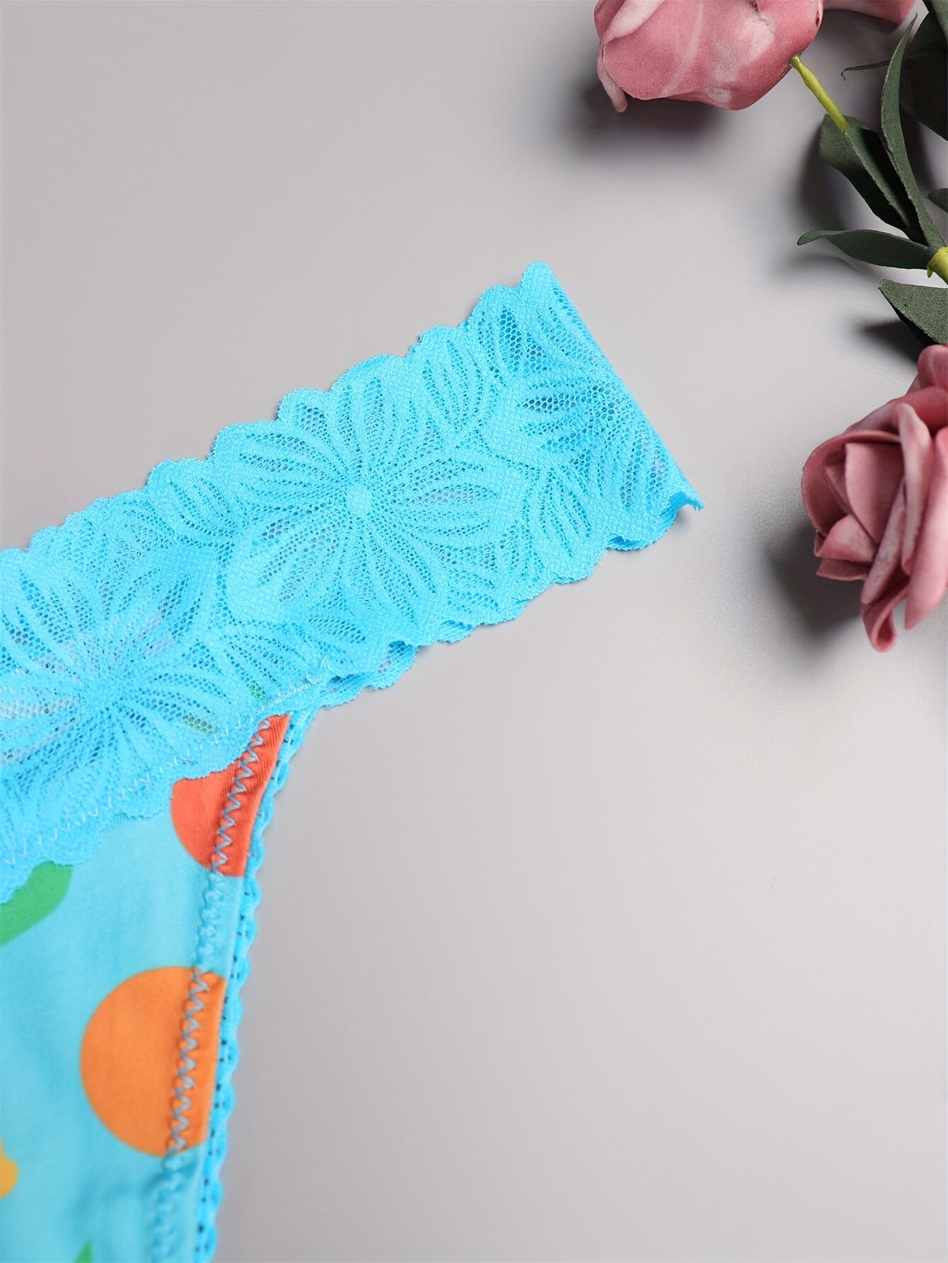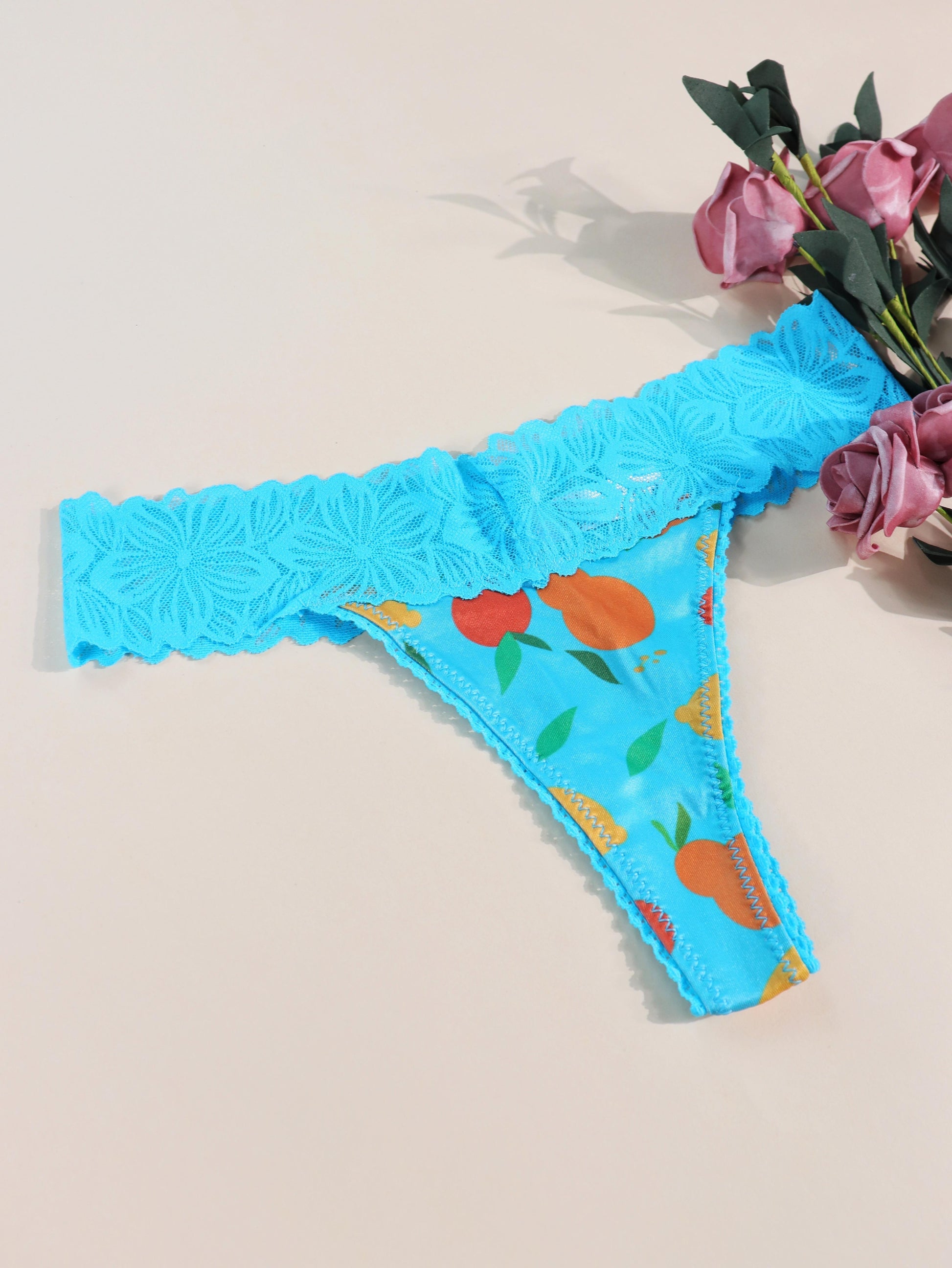Women's Blue Fruits Print Lace Thong G-String Low Waist Lingerie