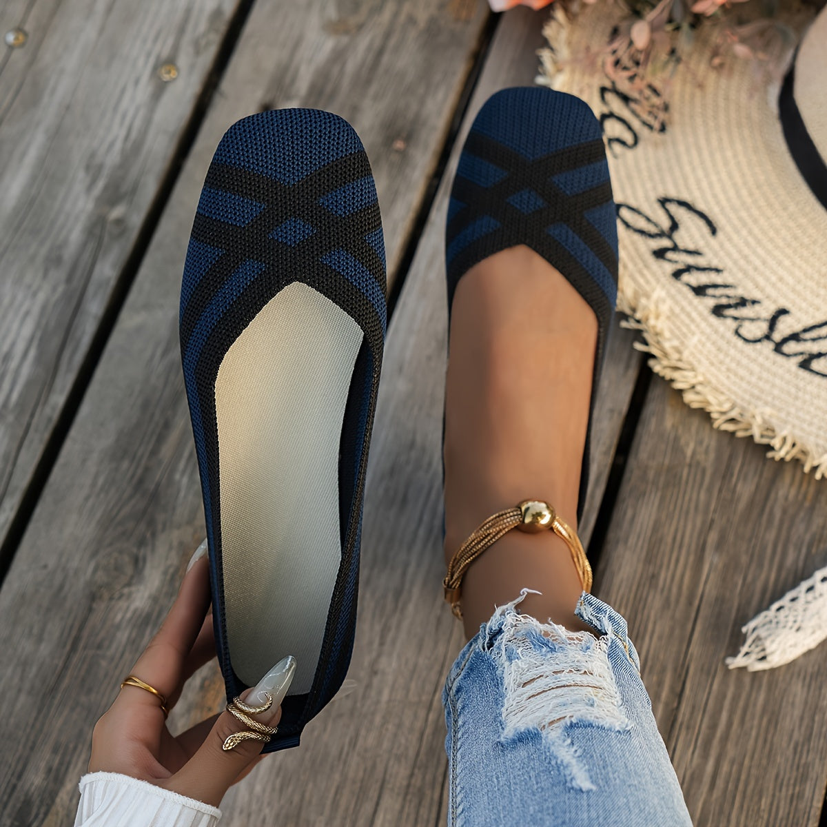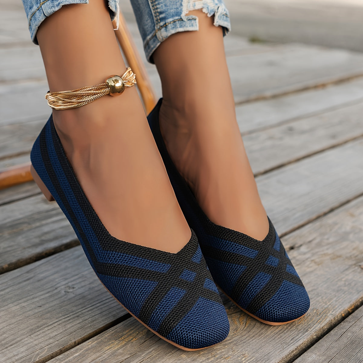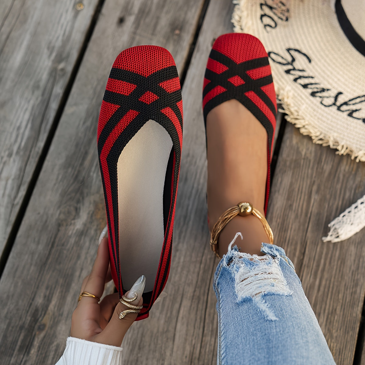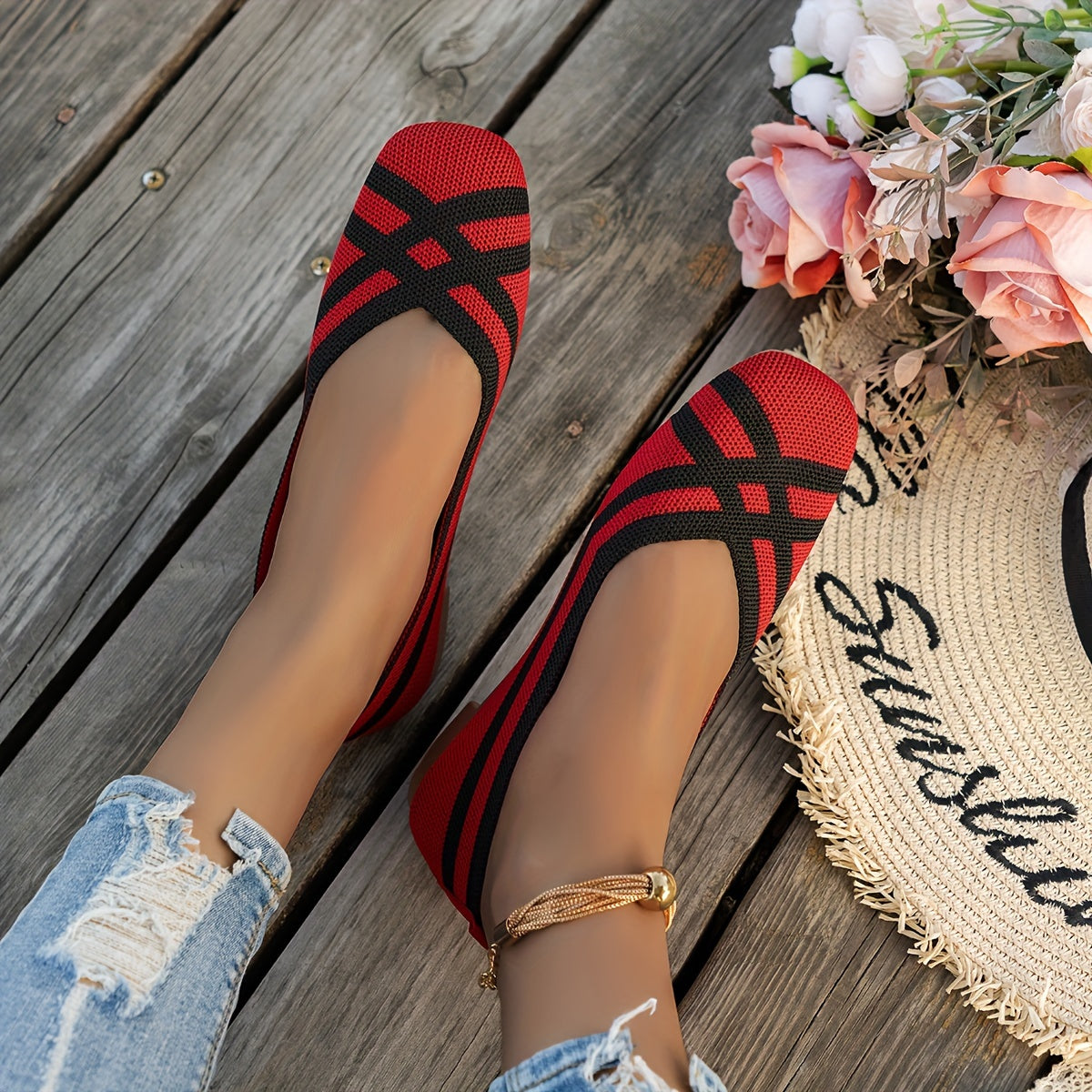 Women's Breathable Non-Slip Ballet Flats with Square Toe and Cross Strap Black White