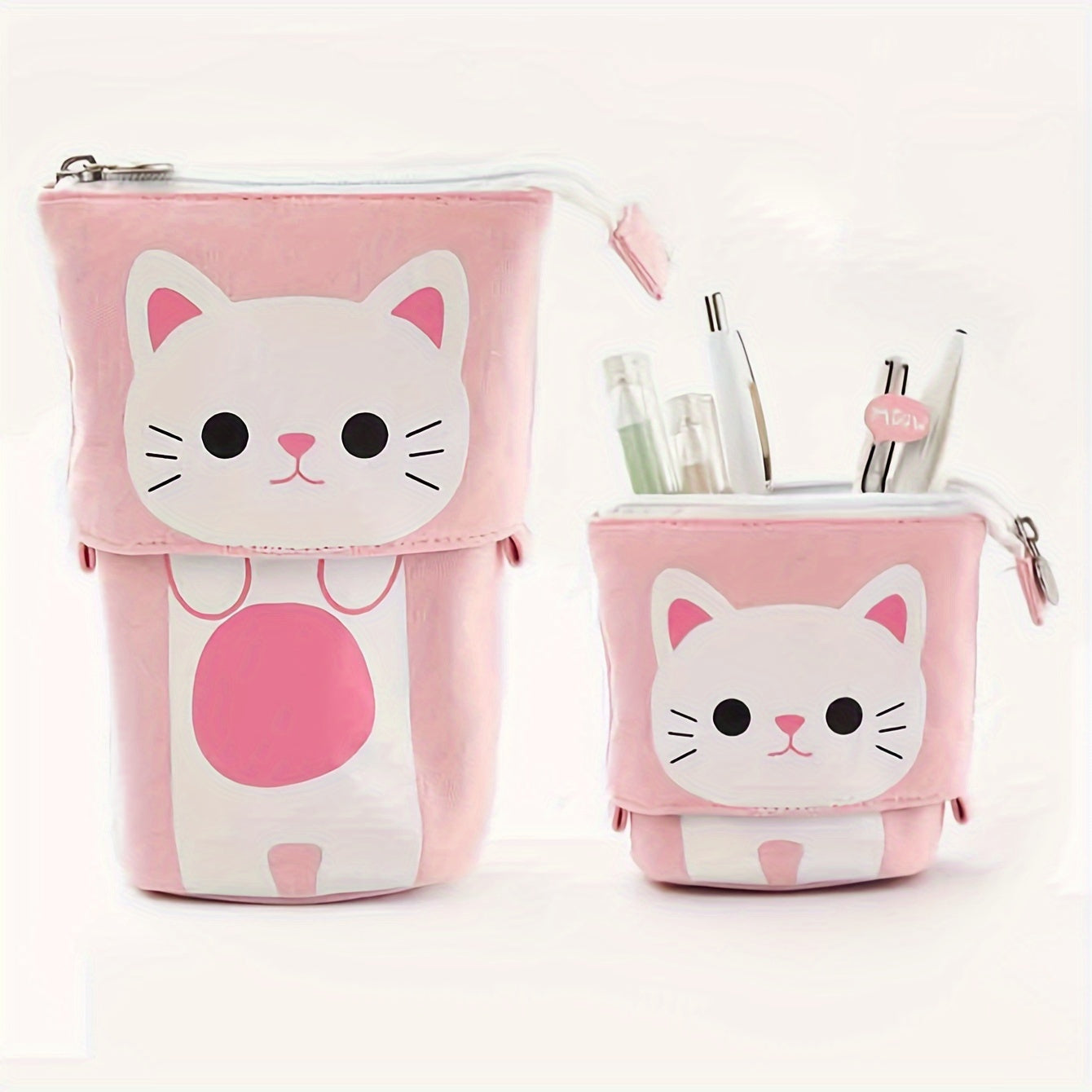 Canvas Cat Pencil Case with Zipper, Expandable, 2-in-1 Telescopic Pouch for Students