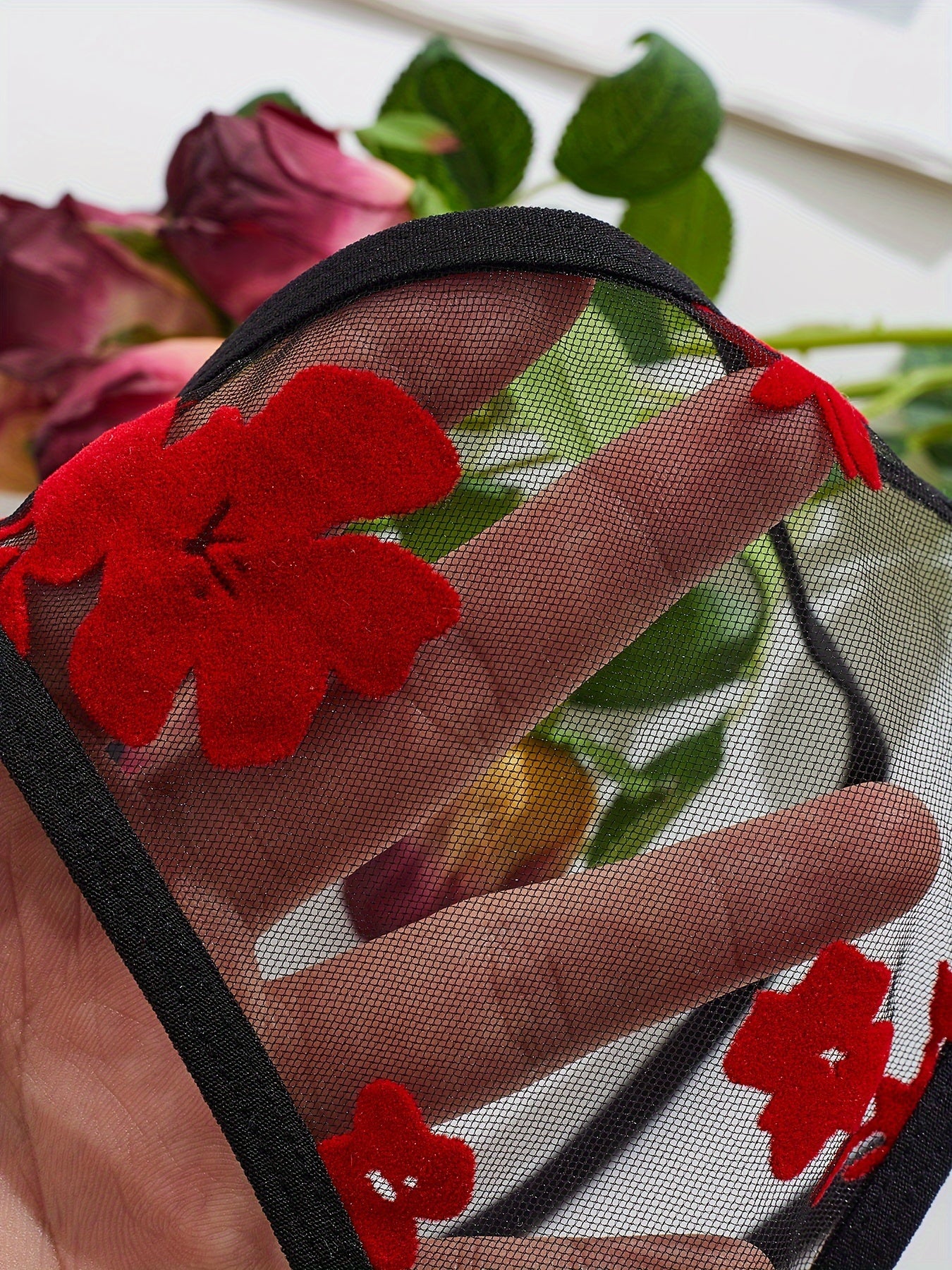 Women's Black and Red Floral Lace Lingerie Set with Bralette and Thong