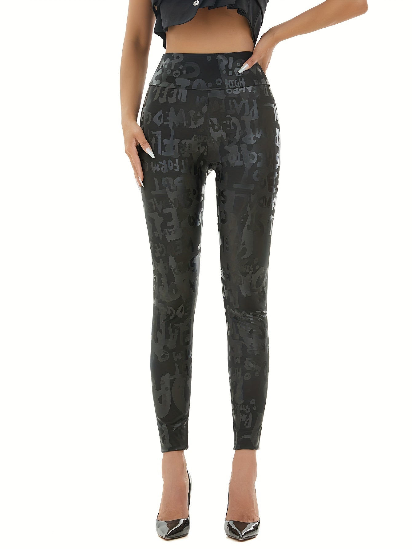 Women's Faux Leather High-Waisted Lounge Pants with PU Letter Print All-Season